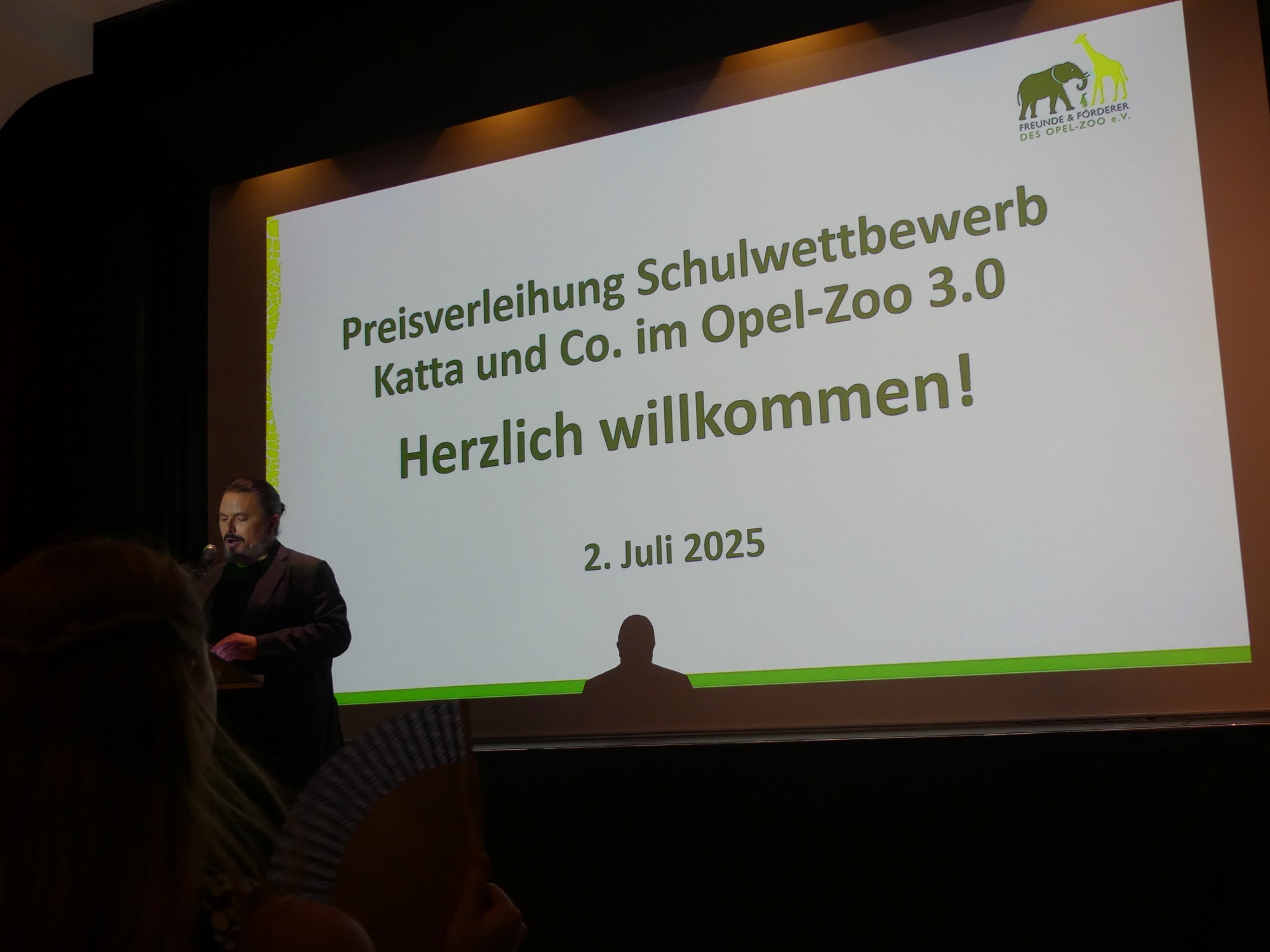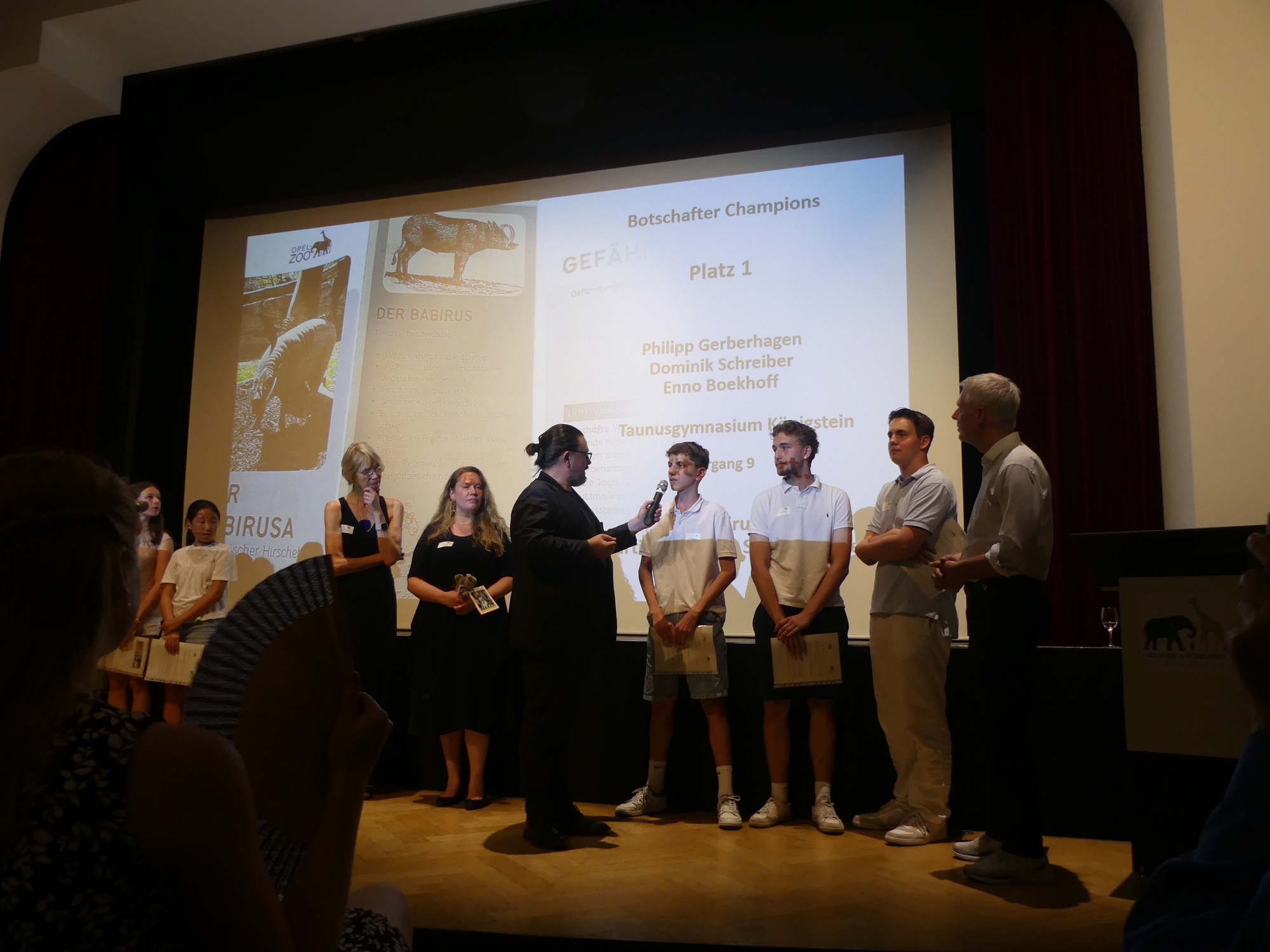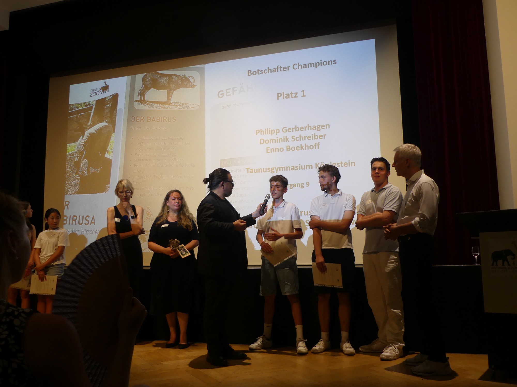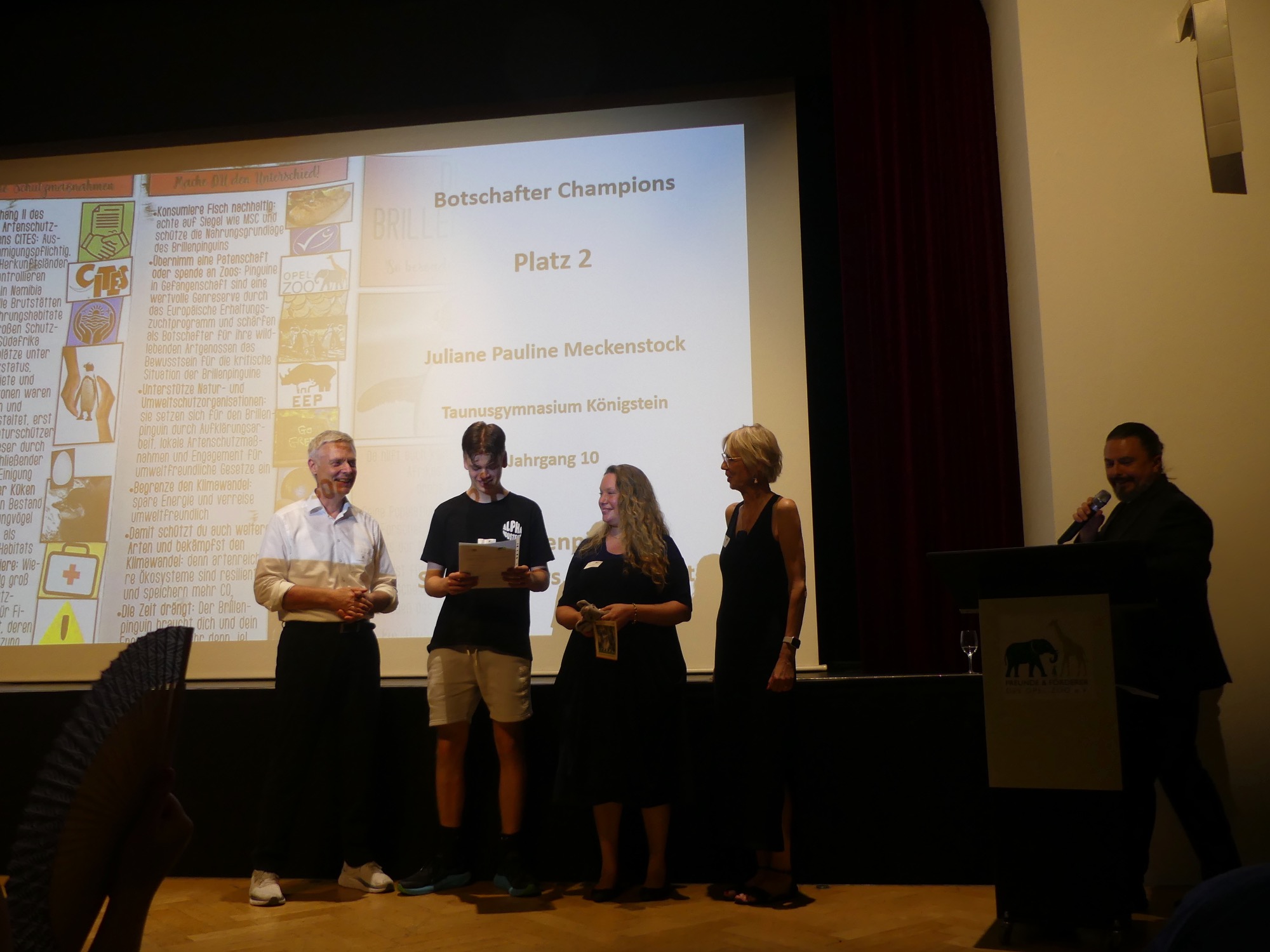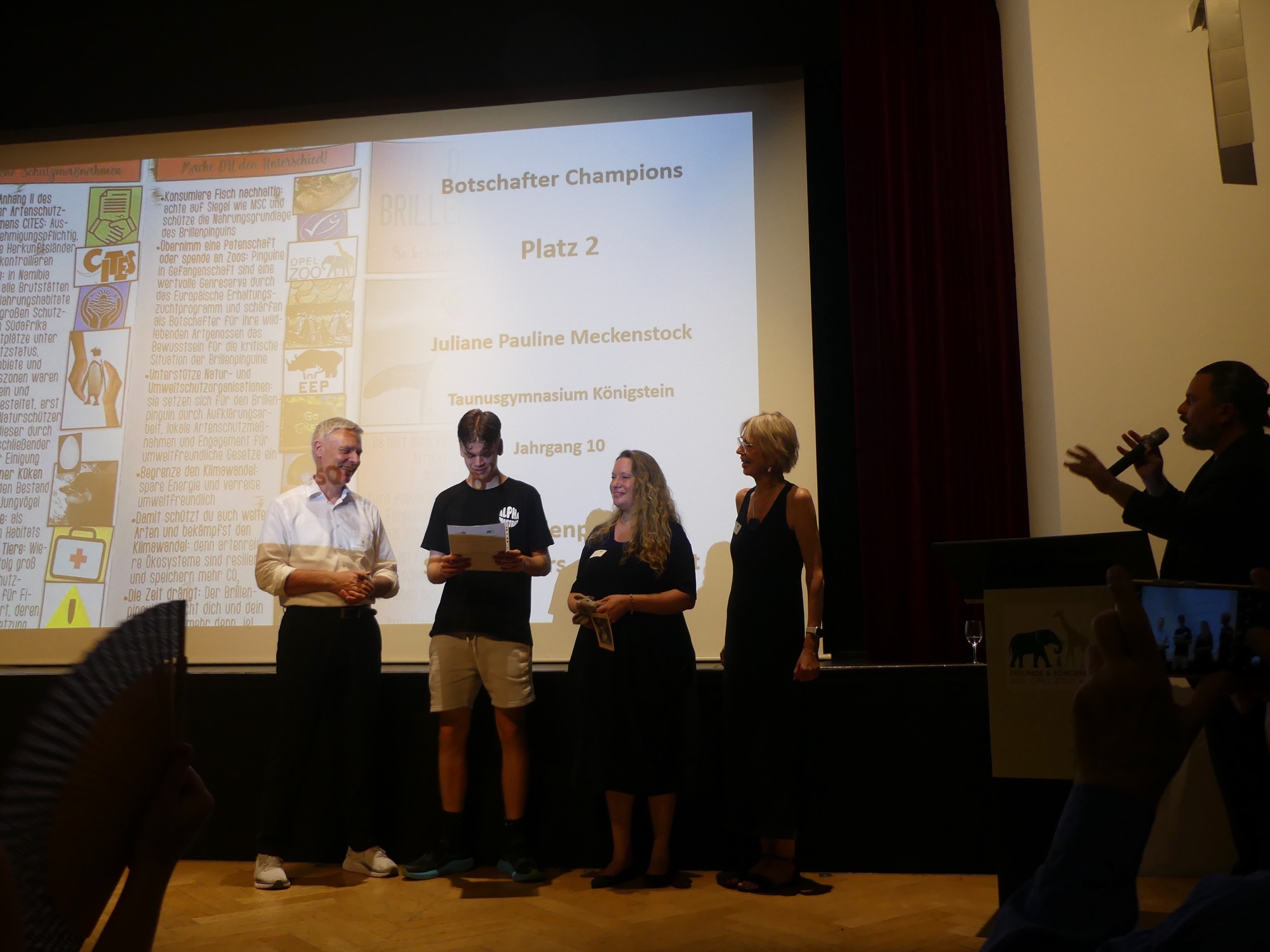 Der Abend wurde von einem abwechslungsreichen Programm gerahmt und von Stephan Hübner, Redakteur für Bildung und Wissenschaft beim Hessischen Rundfunk, kenntnisreich und humorvoll moderiert. Mehrere musikalische Beiträge steuerte der Chor unter Leitung von Frau Büttner bei, begleitet von Herrn Leichtfuß am Piano. Anschließend zollten einige hochkarätige Redner den Teilnehmenden ihren Respekt. Besonders bewegend waren die Worte von Staatssekretär Dr. Manuel Lösel vom Hessischen Ministerium für Kultus, Bildung und Chancen, der als Schirmherr des Wettbewerbs die Siegerurkunden überreichte: „Heute werden nicht nur Preise verliehen, denn wir feiern, was wirklich zählt: den Einsatz für unsere Erde, ihre Tiere und unsere Zukunft. Die prämierten Schülerinnen und Schüler haben verstanden: Lernen endet nicht an der Schultür – genau das macht außerschulische Lernorte wie den Opel-Zoo so wertvoll.“
