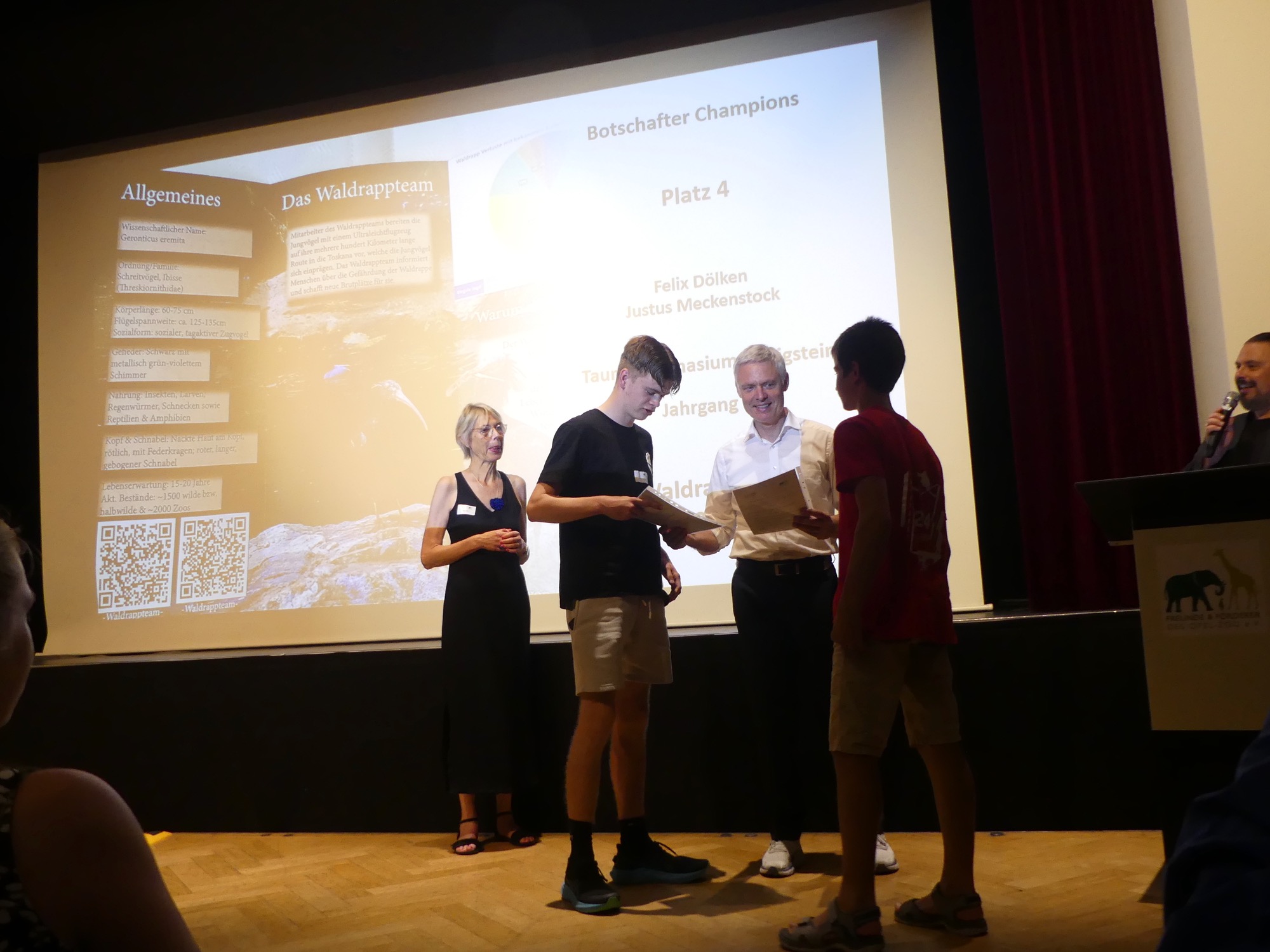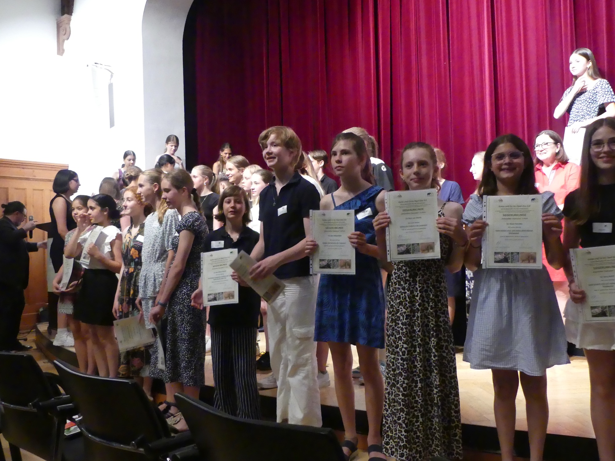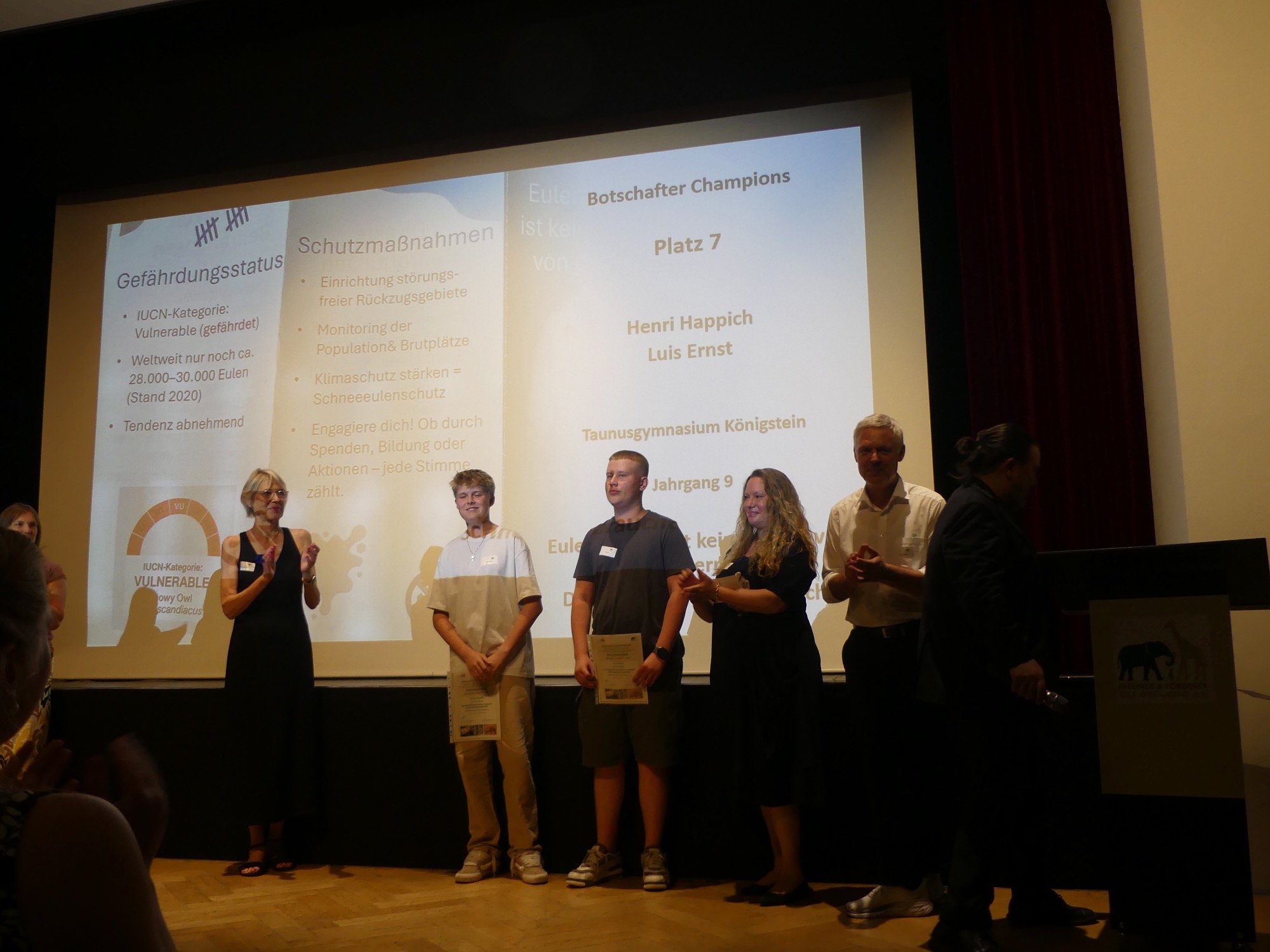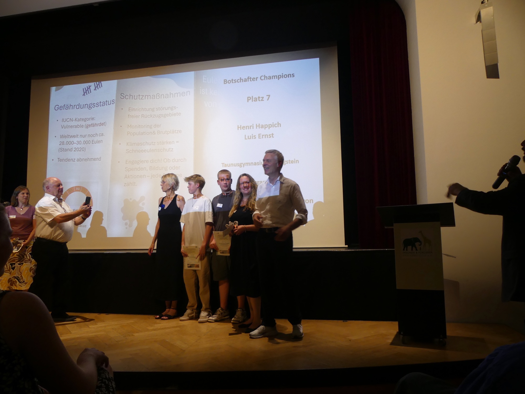 Der Abend wurde von einem abwechslungsreichen Programm gerahmt und von Stephan Hübner, Redakteur für Bildung und Wissenschaft beim Hessischen Rundfunk, kenntnisreich und humorvoll moderiert. Mehrere musikalische Beiträge steuerte der Chor unter Leitung von Frau Büttner bei, begleitet von Herrn Leichtfuß am Piano. Anschließend zollten einige hochkarätige Redner den Teilnehmenden ihren Respekt. Besonders bewegend waren die Worte von Staatssekretär Dr. Manuel Lösel vom Hessischen Ministerium für Kultus, Bildung und Chancen, der als Schirmherr des Wettbewerbs die Siegerurkunden überreichte: „Heute werden nicht nur Preise verliehen, denn wir feiern, was wirklich zählt: den Einsatz für unsere Erde, ihre Tiere und unsere Zukunft. Die prämierten Schülerinnen und Schüler haben verstanden: Lernen endet nicht an der Schultür – genau das macht außerschulische Lernorte wie den Opel-Zoo so wertvoll.“
