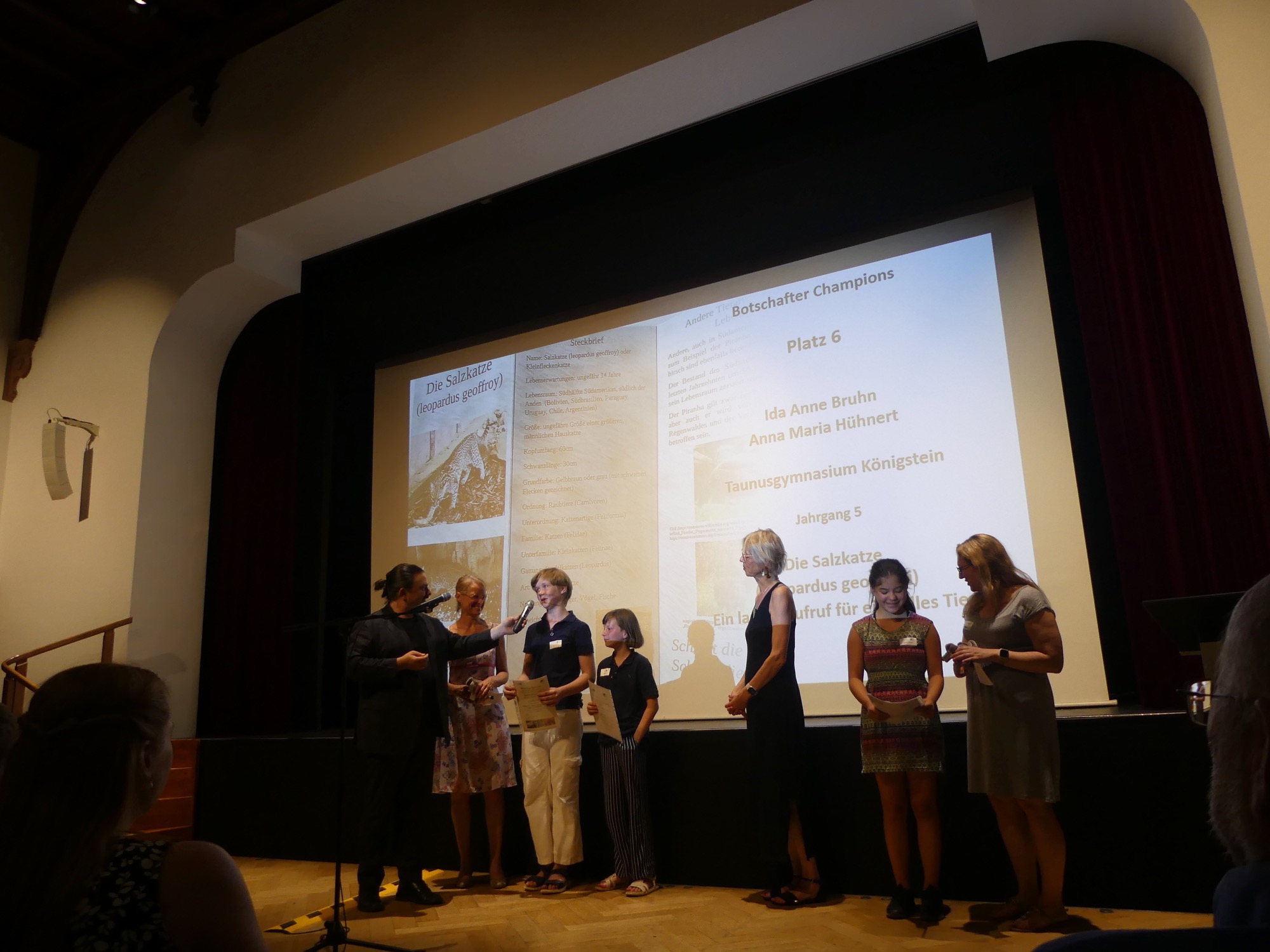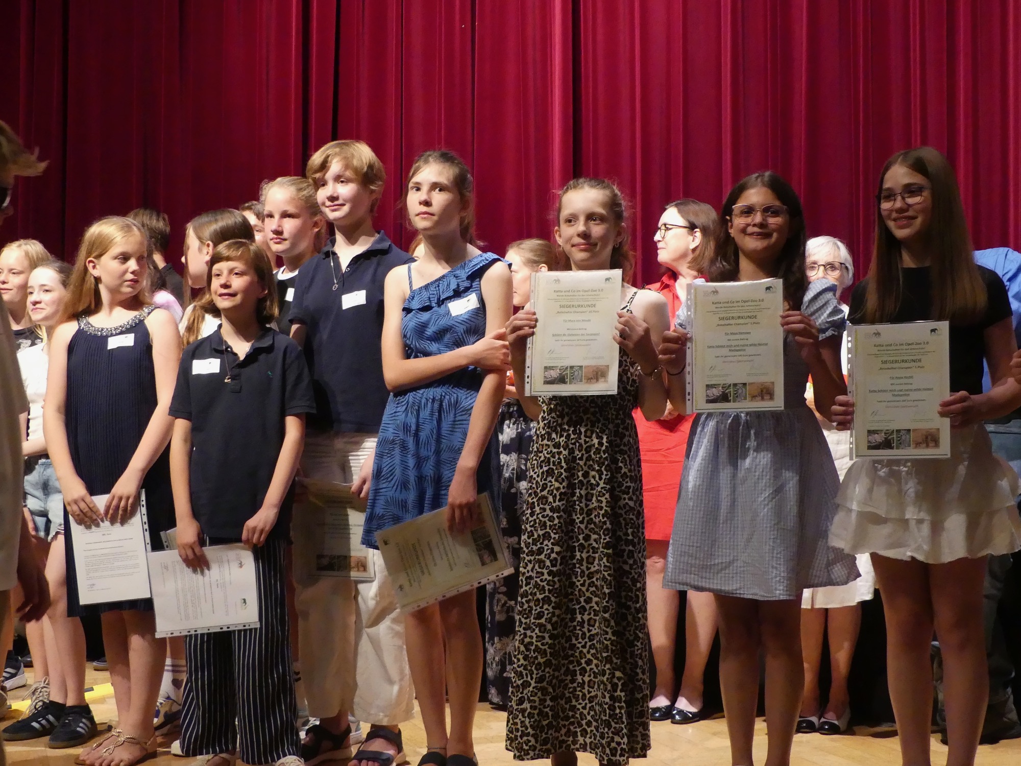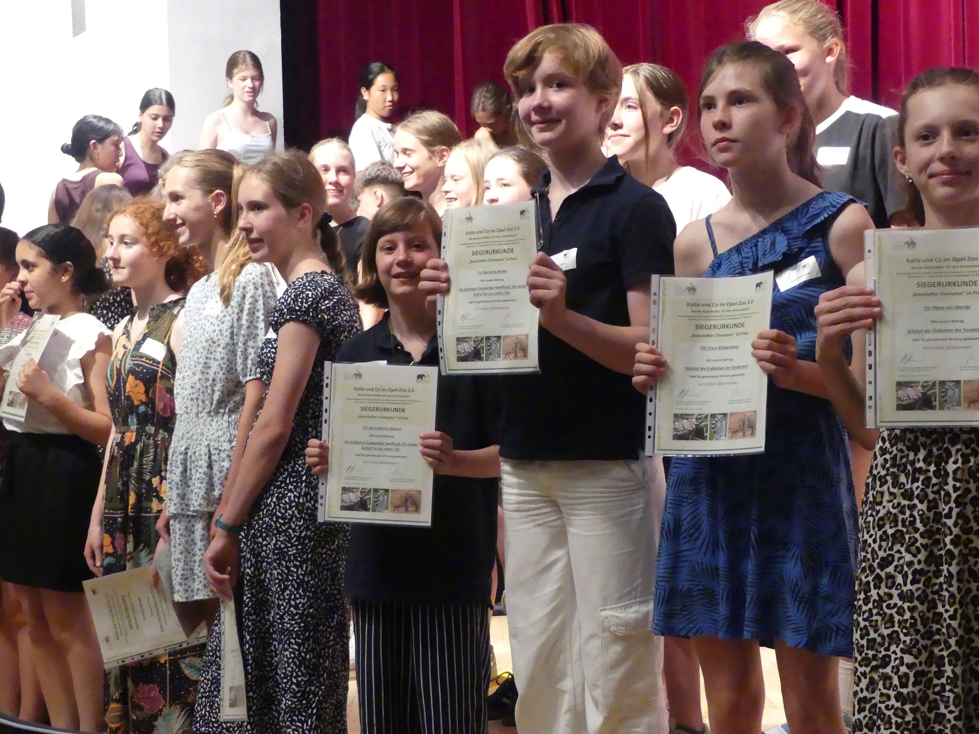 Zum dritten Mal fand der Wettbewerb „Katta und Co im Opel-Zoo“ statt, und erneut räumten Schülerinnen und Schüler des Taunusgymnasiums mit ihren Arbeiten herausragend viele Preise ab. Fünf der zehn besten Beiträge in der Kategorie der Klassen 7 bis 10 stammten von unserer Schule – darunter die beiden ersten Plätze. Auch in der Kategorie der Klassen 5 und 6 konnte sich eine Gruppe des Taunusgymnasiums unter den Top Ten platzieren. Mit 80 angemeldeten Schülerinnen und Schülern stellte das Taunusgymnasium zudem die größte Teilnehmergruppe aller beteiligten Schulen. Die erfolgreichen Teilnehmenden wurden bei einer feierlichen Veranstaltung im Festsaal der Stadthalle Kronberg geehrt und nahmen stolz ihre Urkunden in Empfang – an einem Tag mit tropischen Temperaturen, dem bisher heißesten Tag des Jahres.
