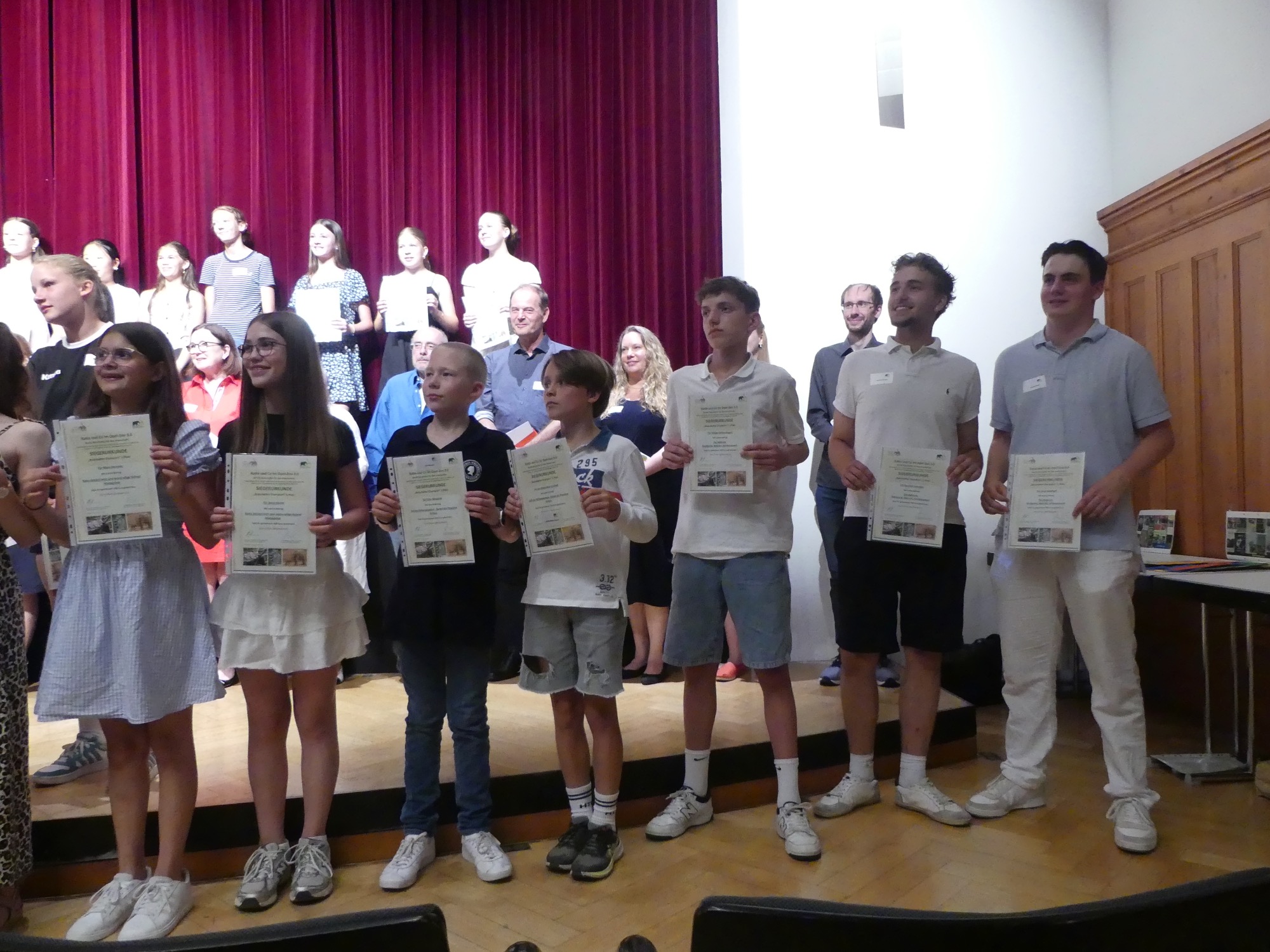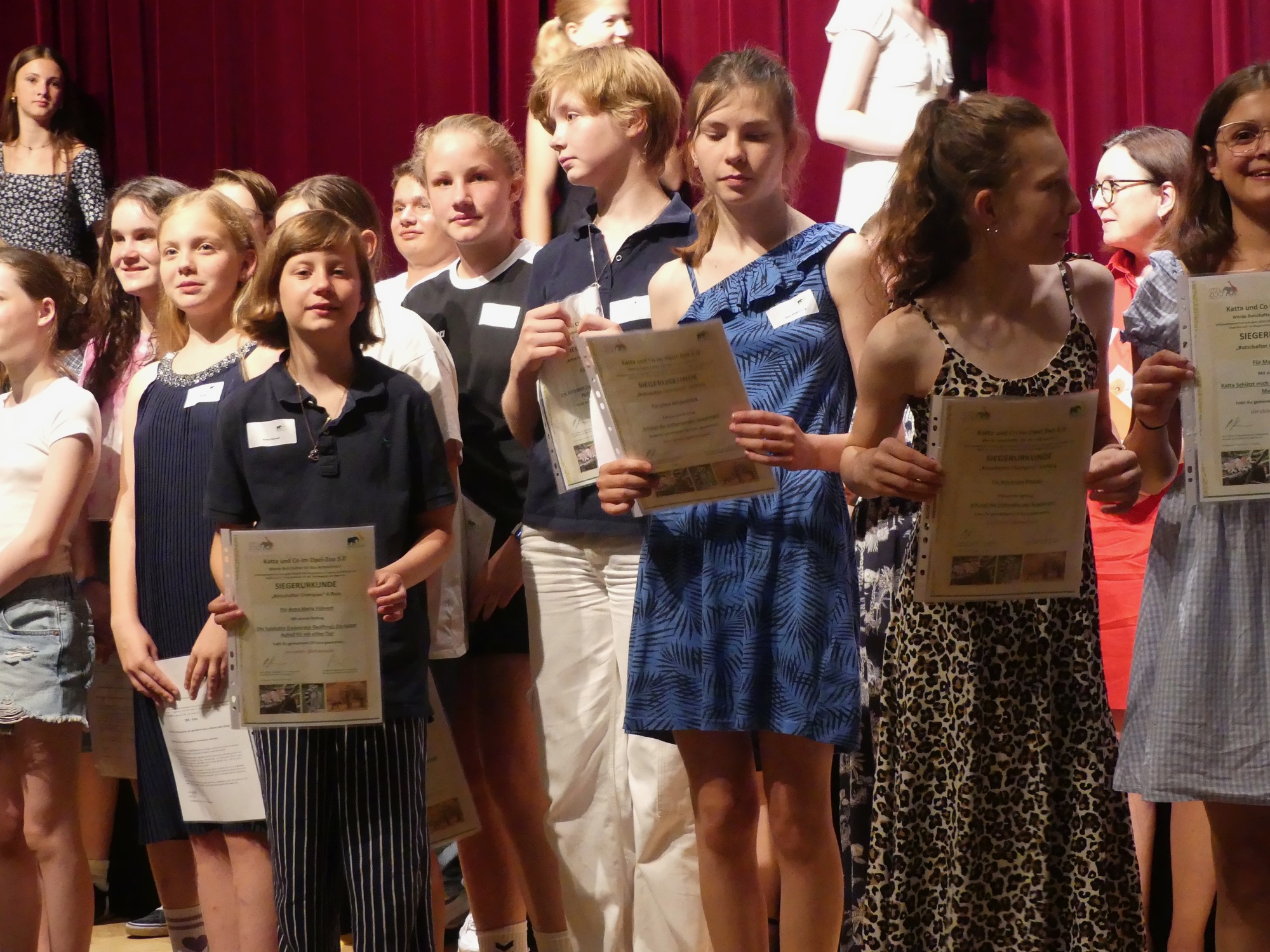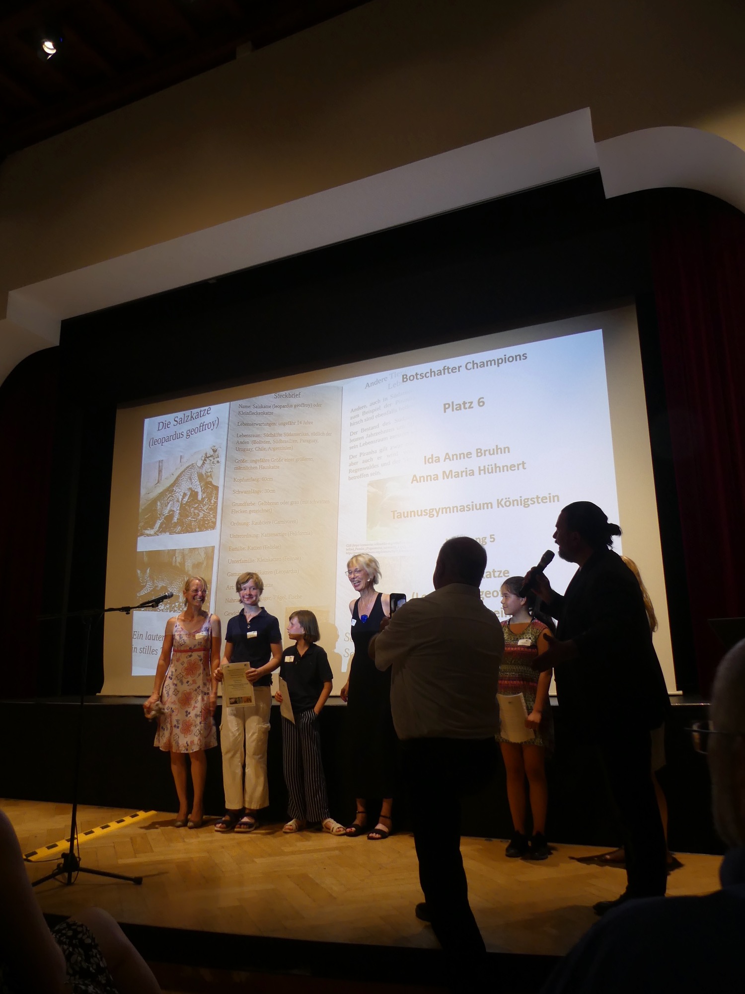 Zum dritten Mal fand der Wettbewerb „Katta und Co im Opel-Zoo“ statt, und erneut räumten Schülerinnen und Schüler des Taunusgymnasiums mit ihren Arbeiten herausragend viele Preise ab. Fünf der zehn besten Beiträge in der Kategorie der Klassen 7 bis 10 stammten von unserer Schule – darunter die beiden ersten Plätze. Auch in der Kategorie der Klassen 5 und 6 konnte sich eine Gruppe des Taunusgymnasiums unter den Top Ten platzieren. Mit 80 angemeldeten Schülerinnen und Schülern stellte das Taunusgymnasium zudem die größte Teilnehmergruppe aller beteiligten Schulen. Die erfolgreichen Teilnehmenden wurden bei einer feierlichen Veranstaltung im Festsaal der Stadthalle Kronberg geehrt und nahmen stolz ihre Urkunden in Empfang – an einem Tag mit tropischen Temperaturen, dem bisher heißesten Tag des Jahres.