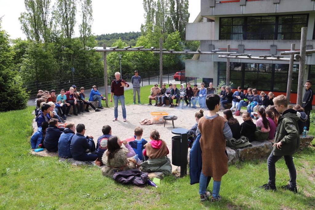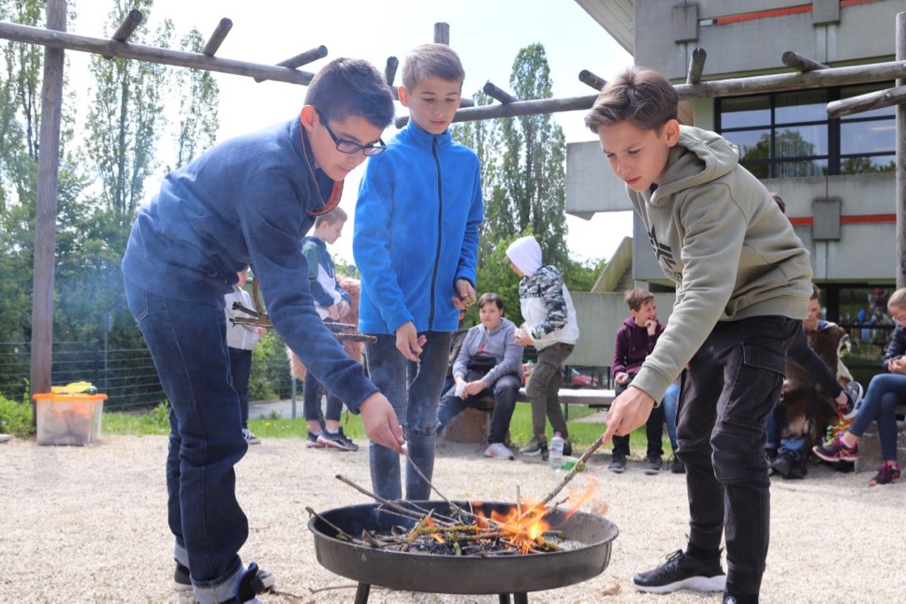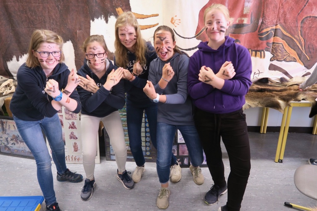 Für die Klasse 6a fügte sich der Steinzeittag in das fächerübergreifende Steinzeitprojekt im Fach Deutsch ein. Die Klasse las begleitend den Roman „Mit Jeans in die Steinzeit“ und hatte am vorausgehenden Dienstag einen Kreativtag zum Malen mit Erdfarben erlebt.