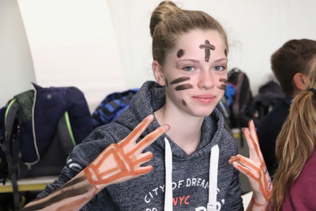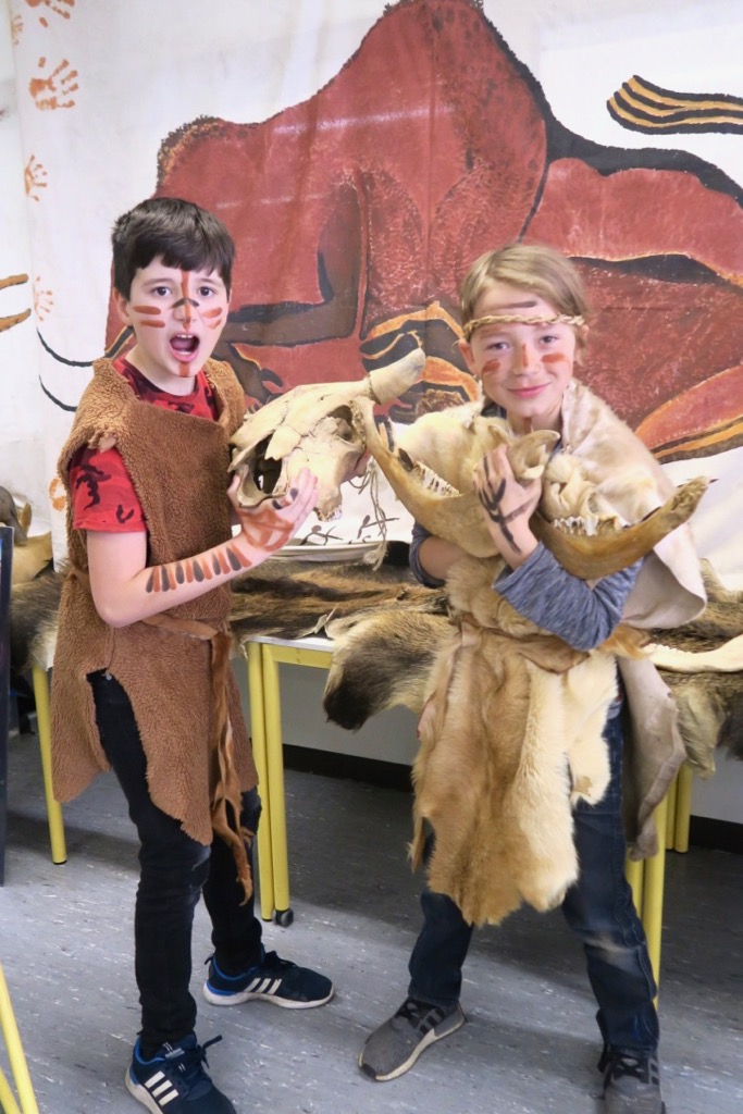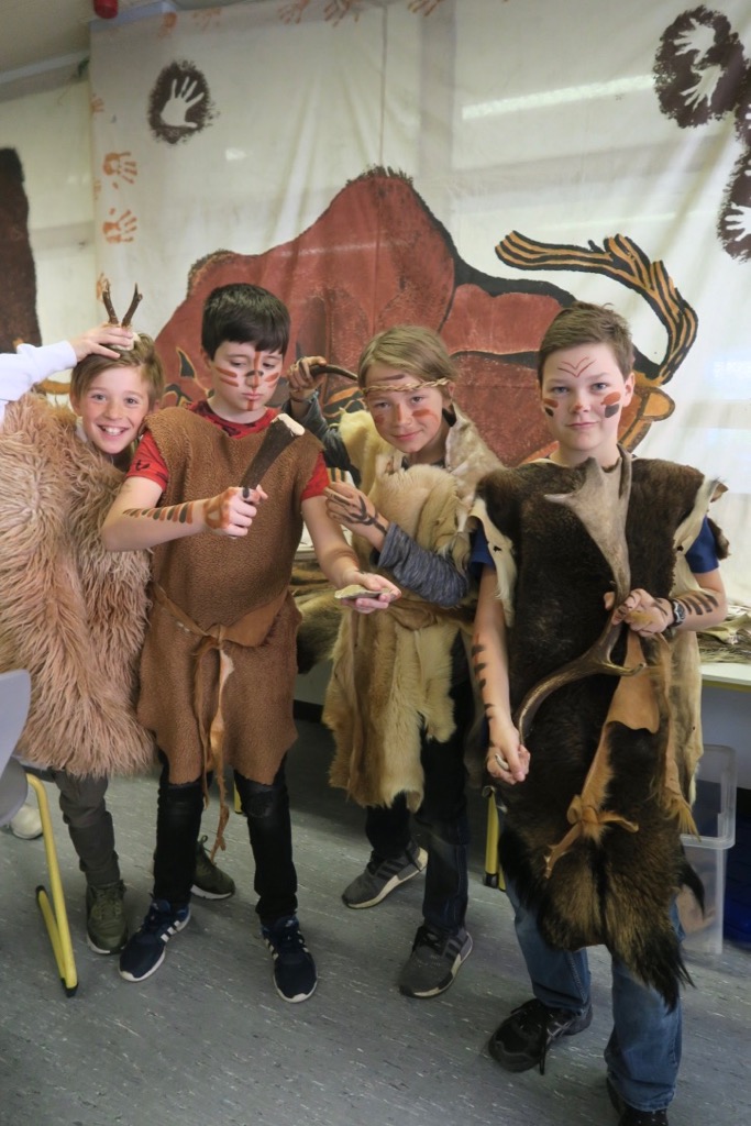 Er hatte im Raum 123 der Schule ein Museum zum Anfassen aufgebaut. Auch hatte er Felle mitgebracht, die wir dann für den ganzen Tag anziehen durften. Auch wenn die Steinzeitmenschen keine Kleidung wie wir heute hatten, denke ich, dass sie vermutlich nicht frieren mussten. Denn mir war überraschend warm in dieser steinzeitlichen Kleidung. Die Blicke, die auf uns ruhten, während wir in der Pause mit unseren Fellen herumliefen, waren sehr amüsant. Zu den Fellen durften wir uns auch noch mit Farben aus mit Wasser angerührten Erden in verschiedenen Tönen bemalen. Als Pinsel dienten uns Federn.