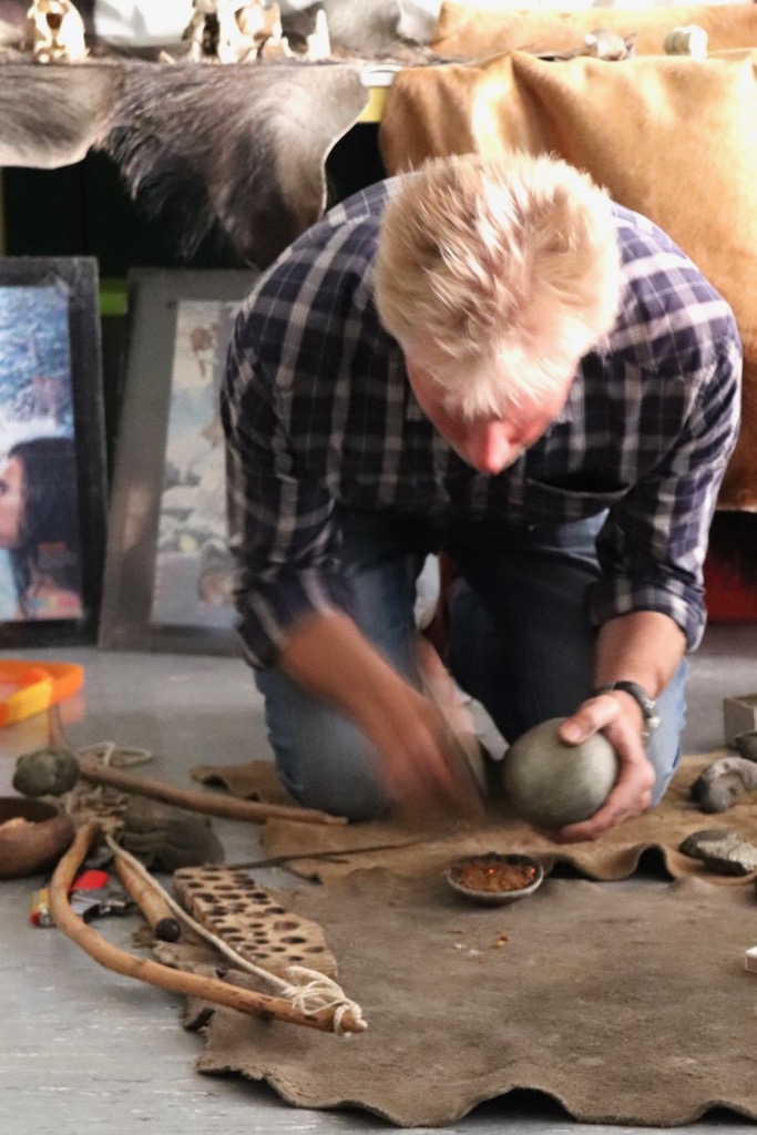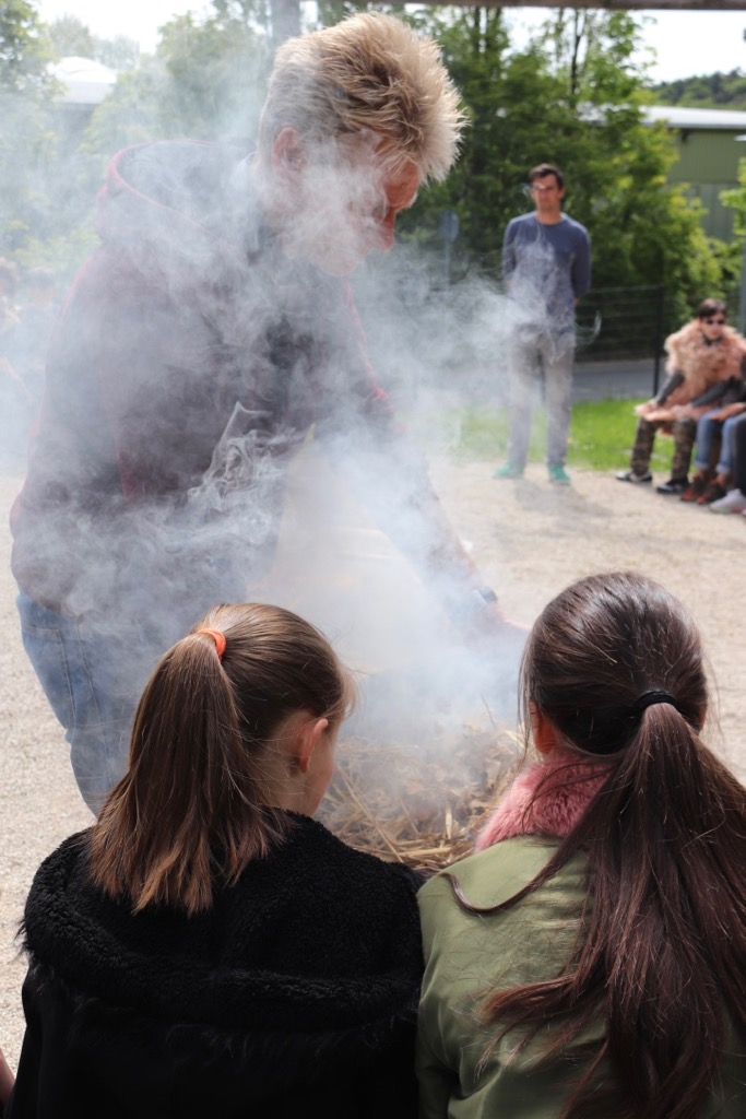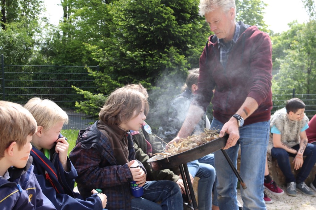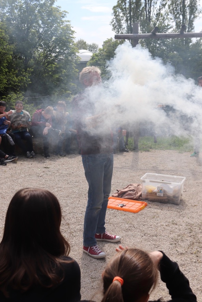 Herr Dr. Rittweger hielt zuerst einen Vortrag über die Steinzeit und über die Lebensweise der Steinzeitmenschen. Wie die alten Steinzeitmenschen Feuer machten, zeigte er uns auch. Die Steinzeitmenschen nahmen einen Stock, ein Brett und einen Bogen und stellten dann den Stock auf das Brett und fixierten dies dann mit dem Bogen. Wenn die Steinzeitmenschen den Bogen dann sehr schnell hin und her zogen, drehte sich der Stock, und durch die Reibung ging das Feuer an. Der Feuermelder wäre angesprungen, wenn Herr Dr. Rittweger das Feuer zu lange hätte brennen lassen. Deshalb konnten wir nur den Rauch des angehenden Feuers sehen.