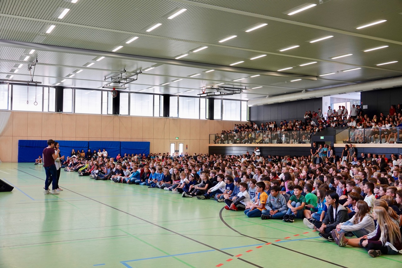 Zum ersten Male fand er statt, der „Auftakt“, und er erinnerte ein wenig an die allmorgendlich an britischen Schulen stattfindende „Assembly“. Die Idee dahinter ist ähnlich: Nicht einfach „irgendwie“ das neue Schuljahr zu beginnen, sondern im Rahmen einer gemeinschaftsstiftenden Veranstaltung einander wahrzunehmen, sich auf das Kommende einzustellen und mit den „latest news“ versorgt zu werden, die alle – als Schulgemeinschaft – betreffen. Mit einigen rhythmischen Aufwärmübungen kam die Sache in Schwung, danach begrüßte der Schulleiter die Schulgemeinde und stellte die neuen Kolleginnen und Kollegen vor. Der Schulsprecher gab seinen Mitschülerinnen und Mitschülern motivierende Worte mit auf den Weg, und das Vertrauenslehrer-Team stellte sich vor – für alle Fälle. Schließlich wurde das Motto des Schuljahres ausgegeben: „Sozial – tolerant – respektvoll“ lautet der Leitspruch für dieses Schuljahr – und hoffentlich noch weit darüber hinaus.