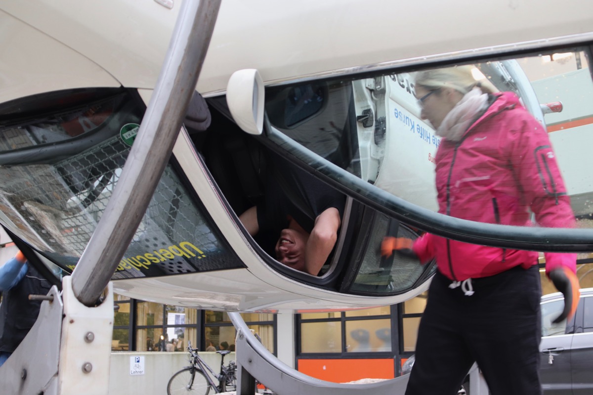 Nach einer allgemeinen Einführung von Frau Klaus (Hessische Polizei) im Theaterraum verteilten sich die Schülerinnen und Schüler auf fünf abwechslungsreiche Stationen: So etwa am Überschlagsimulator, bei dem man unter Anleitung von Herrn Fischer und seinen Kollegen am eigenen Leib erfahren konnte, wie es sich in einem überschlagenen Auto sitzt, und wie man sich daraus befreien kann. An der zweiten Station wurden Sofortmaßnahmen am Unfallort von Herrn Libbert (DRK Königstein) demonstriert.