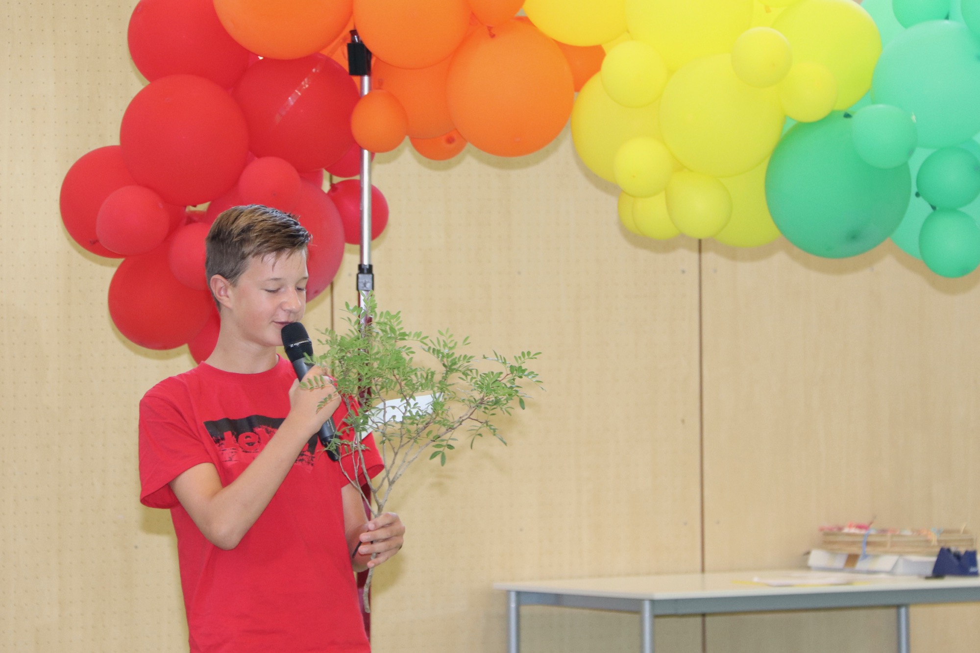 Beim ökumenischen Gottesdienst, der von Herrn Weckler geleitet und zusammen mit Frau Antony vorbereitet worden war, stand das Symbol des Regenbogens im Mittelpunkt. Die Vielfalt der Menschen am Gymnasium wurde dabei besonders betont. Bei der Lesung kam zudem Noah zur Sprache, an dessen Bund mit Gott ein Regenbogen erinnern soll. Die Farben des Regenbogens erweckten Sechstklässler in Bezug auf die Schule zum Leben – etwa mit dem Symbol eines dunkelblauen Bandes, das für die neuen Freundschaften stehe, die die Kinder in Kürze schließen werden. Gerahmt wurde der Gottesdienst von Sänger*innen und Musiker*innen aus Chor und Orchester unter der Leitung von Frau Büttner; gemeinsam mit den anwesenden Kindern, Eltern und Lehrkräften wurden die Lieder „Unser Leben sei ein Fest“, „Regenbogen, Hoffnungszeichen“ und „Herr, wir bitten: Komm und segne uns“ gesungen. Herr Weckler schloss mit einem herzlichen Segen, in dem er den Fünftklässler*innen viel Kraft im neuen Schuljahr, viel Freude und nette neue Freunde wünschte – und dass Gott immer bei ihnen sei, in schönen wie auch schweren Zeiten. Als Erinnerung an den feierlichen Gottesdienst erhielten die Kinder Regenbogen-Kärtchen von Frau Antony, die von E-Phasen-Schüler*innen mit handgeschriebenen guten Wünschen versehen worden waren.