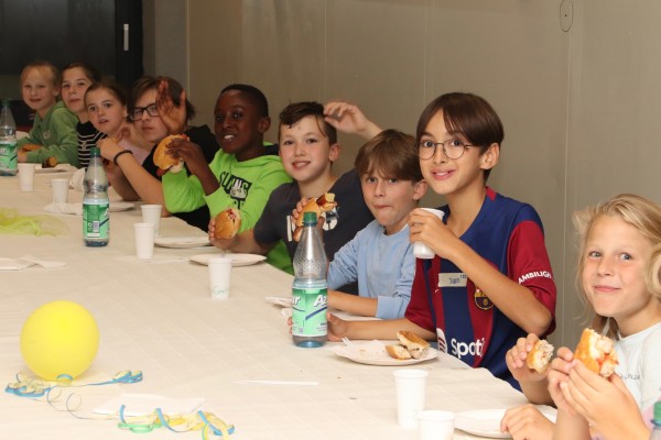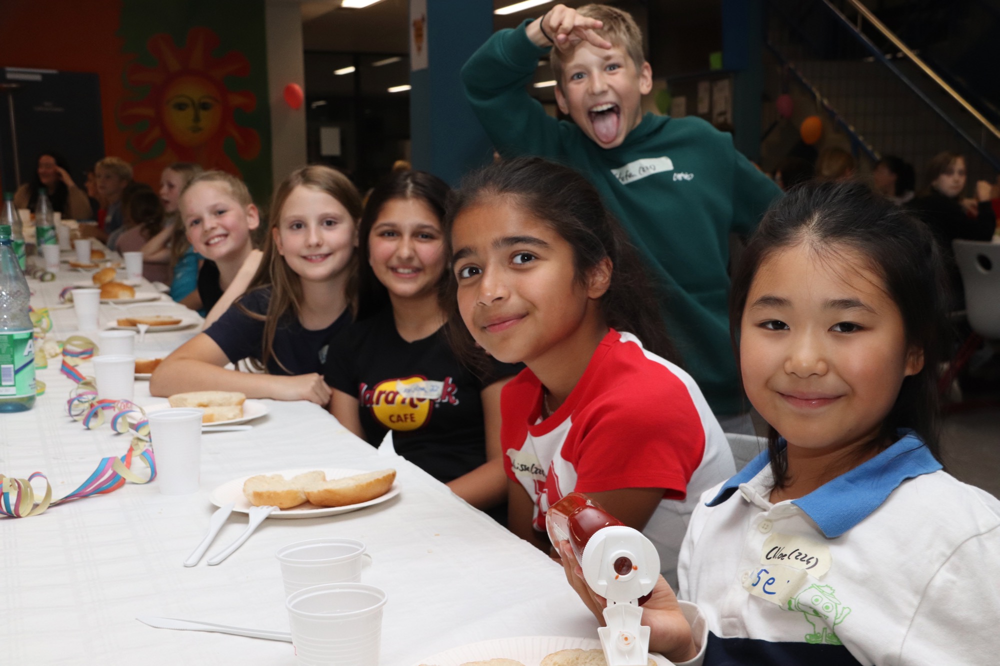 Alle Fünftklässlerinnen und Fünftklässler kamen an diesem Freitagabend, um ihre neue Schule von einer ganz anderen Seite kennen zu lernen. Nach Gruppenspielen in den Klassenräumen folgte an riesigen Tafeln das gemeinsame Abendessen: verschiedene Sorten Bratwürste und Brötchen – und natürlich reichlich Ketchup.