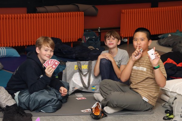 Als die Kinder vom Tanzen müde wurden, war der Weg zum Matratzenlager nicht mehr weit. Die Klassen übernachteten gemeinsam in großen Räumen. Zur Betreuung der Kinder waren außer den Patinnen und Paten auch die Klassenlehrkräfte der fünften Klassen dabei.