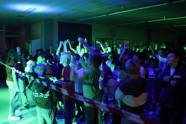 Die große Disco-Party wurde anschließend von den einheitlich in Rot gekleideten Patinnen und Paten mit einem eigens einstudierten Club-Tanz gestartet. Dann tanzten die Kinder, Patinnen und Paten ausgiebig zu druckvollem Sound und aufwändiger Lightshow – verantwortlich dafür zeichnete das Technik-Team, das bei allen schulischen Veranstaltungen für die richtige Beschallung und Beleuchtung sorgt.
