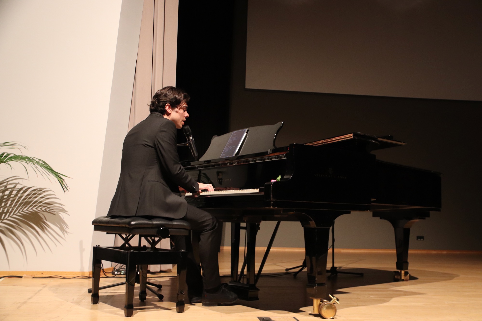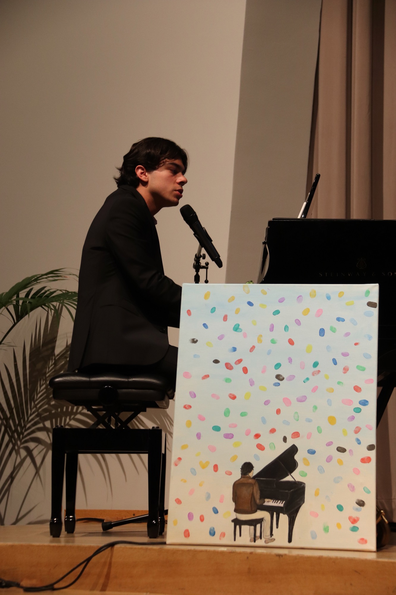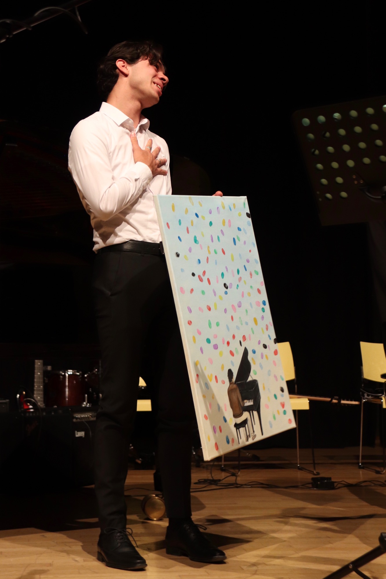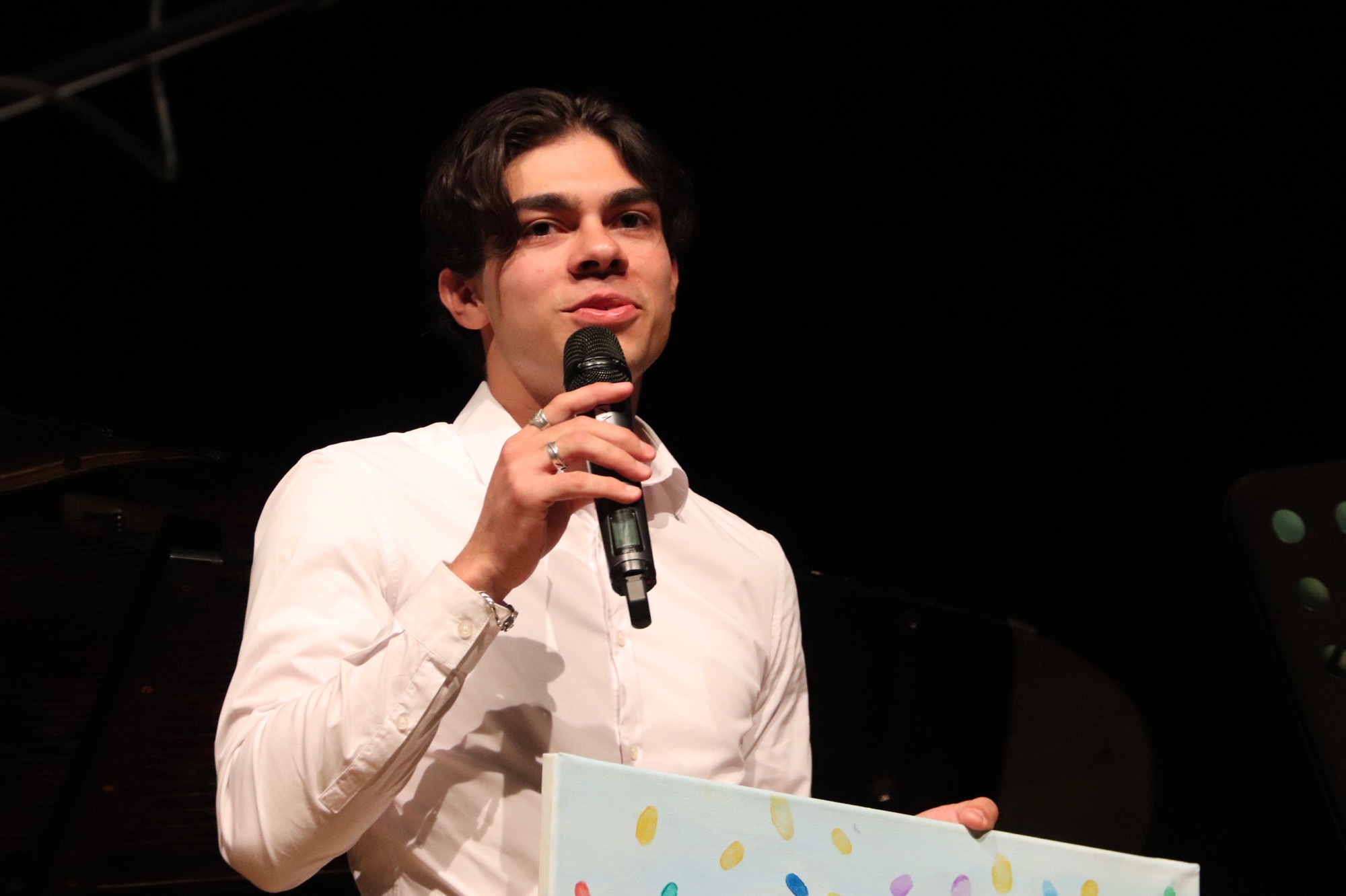 Sehr ausführlich und herzlich wurde nun der Abiturient Lucio Ramírez del Prado Vetter vom Chor verabschiedet, der diesen seit Jahren am Klavier begleitet. Die Kinder hatten sogar ein Video aufgenommen und einen Abschiedssong einstudiert – und ein Bild gemalt, das die Fingerabdrücke aller Sängerinnen und Sänger enthielt. Lucio bedankte sich sichtlich gerührt und gab anschließend das Liebeslied „Hasta que me olvides“ des mexikanischen Sängers Luis Miguel sowie den Klassiker „Piano Man“ von Billy Joel zum Besten.