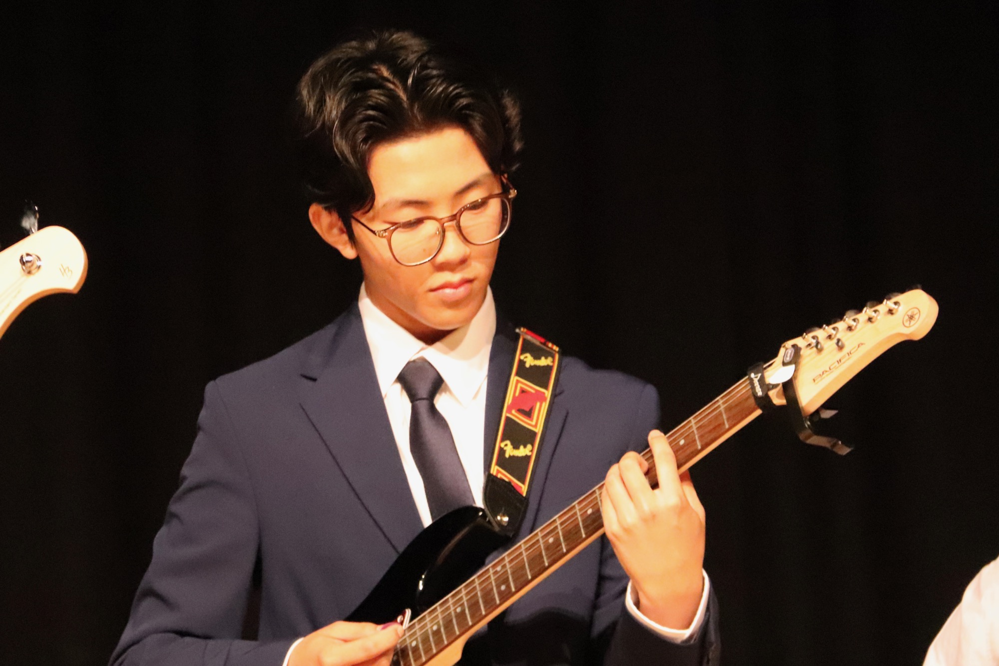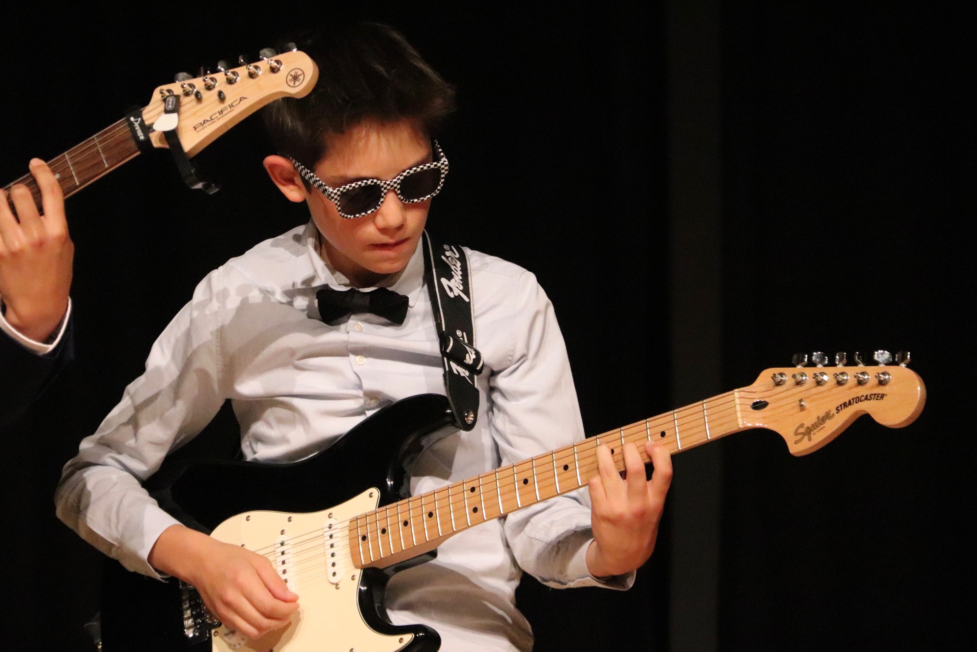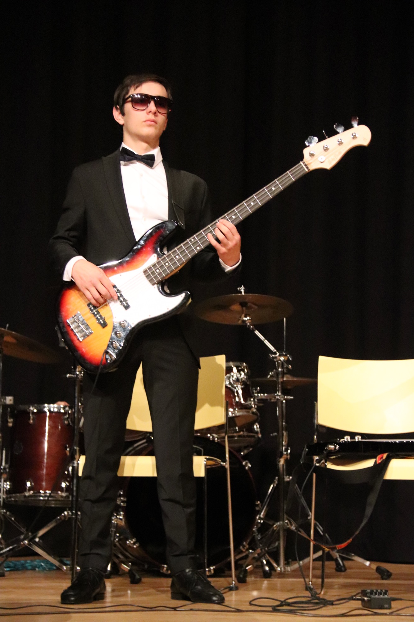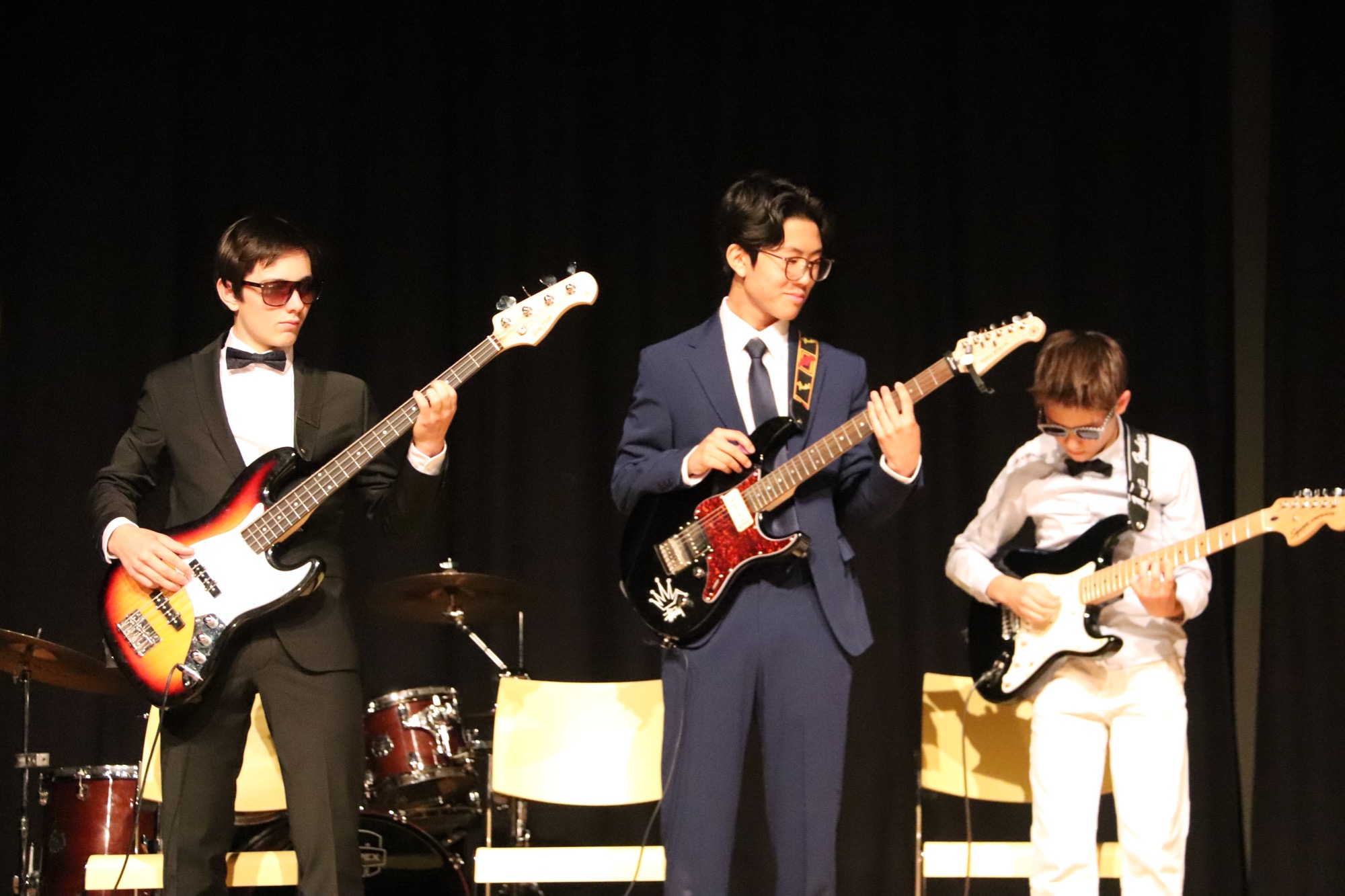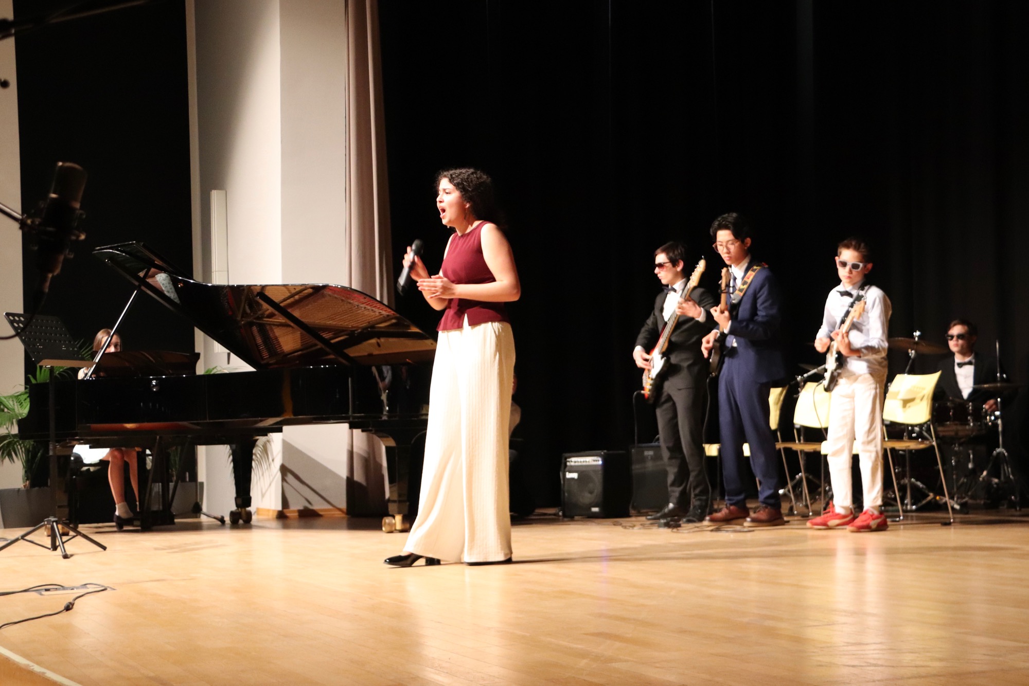 Die neu formierte Band „130“ brachte unter der Leitung von Herrn Franke überzeugend groovend die Songs „Creep“ von Radiohead, „Money Money Money“ von ABBA und „Bust Your Windows“ von Jazmine Sullivan zu Gehör. An den E-Gitarren waren Friedrich Wenzler (5f) und Sunwoo Han (8d) zu hören, am E-Bass Jonathan Bellinghausen (9c), am Schlagzeug Linus Fujita (8d), am Flügel Alexandra Wenzler (Q2). Als Sängerinnen traten Deri Sheppard (8a) und Lenka Ilic (8a) auf. Bei einzelnen Stücken kamen Gabriel Lindenschmidt (E2) am Cello und Yunwoo Koo (Q4) an der Geige hinzu.