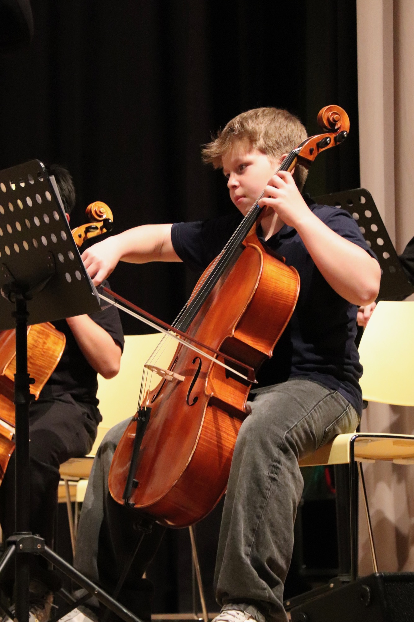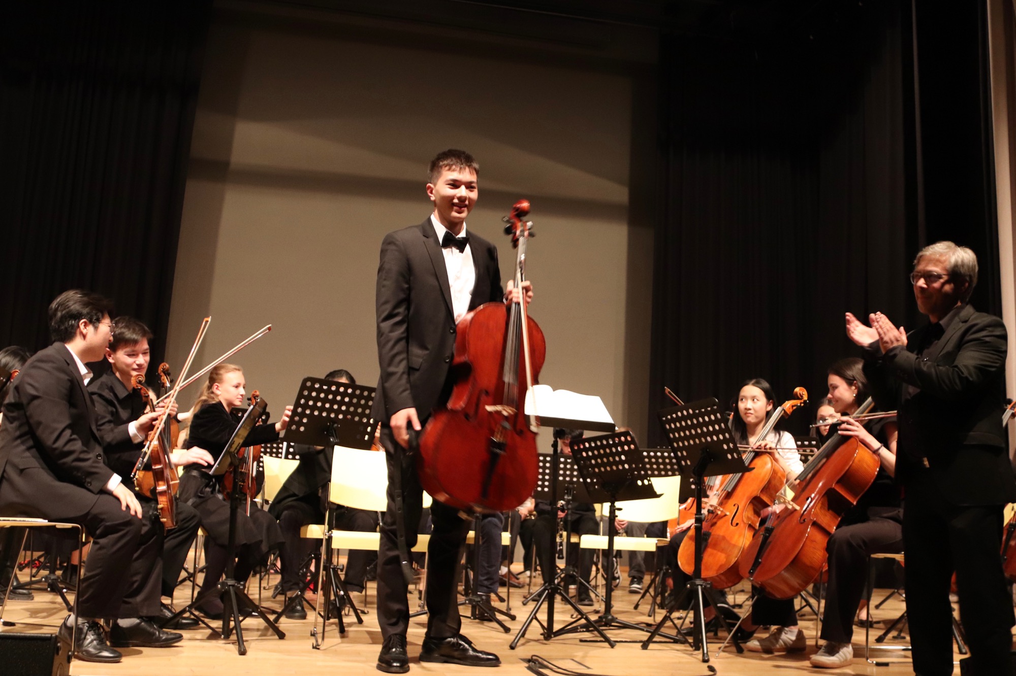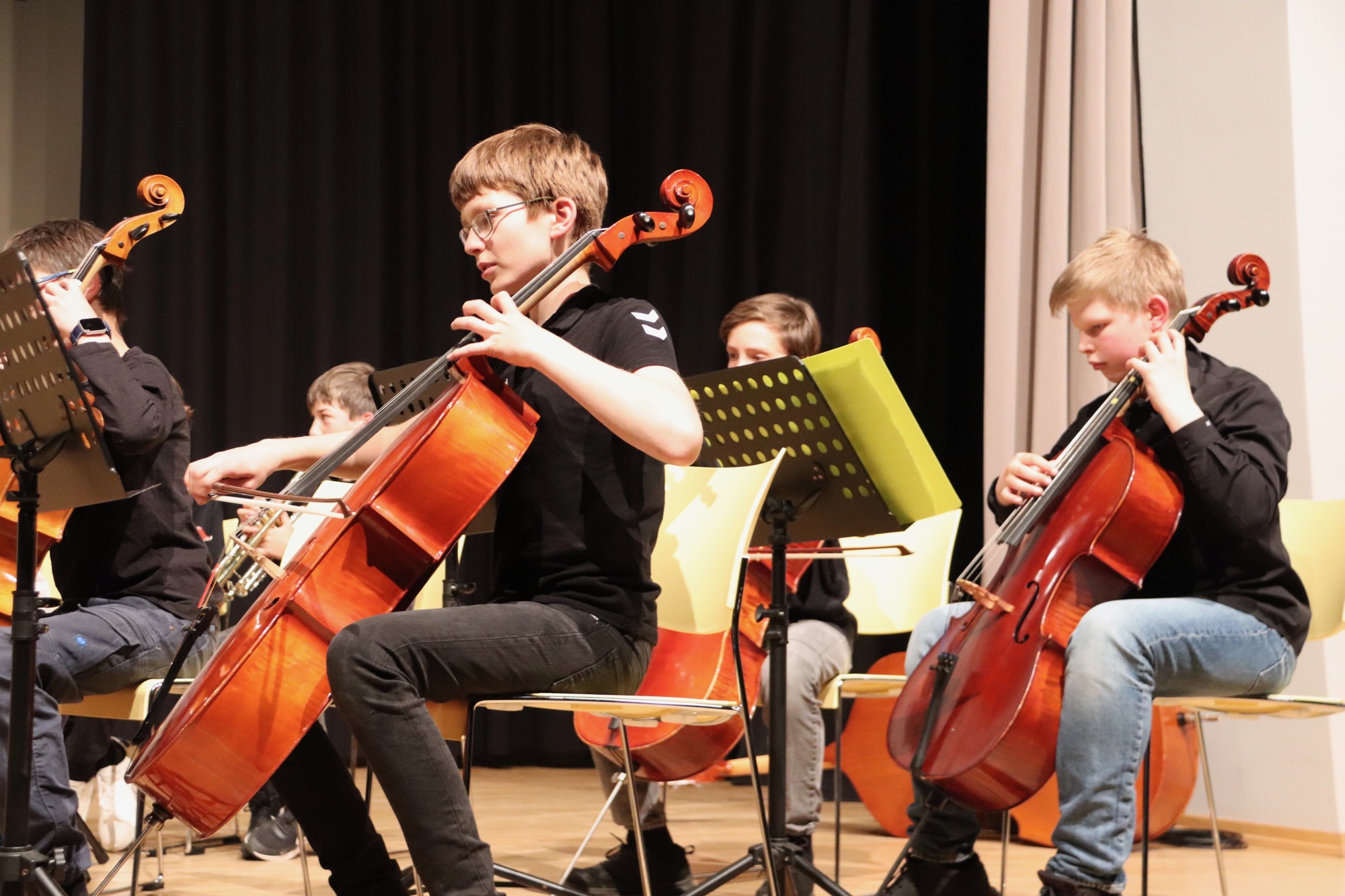 Nach der Pause gehörte dem Großen Orchester unter Leitung von Herrn Neubeck und Herrn Leichtfuß die Bühne, dem mit der Titelmusik des Films „Die glorreichen Sieben“ von Elmer Bernstein ein schwungvoller Einstieg gelang. Beim „Allegro appassionato“ (op. 43) von Camille Saint-Saëns brillierte der mehrfach ausgezeichnete Gabriel Lindenschmidt (E2) als Solist am Cello.