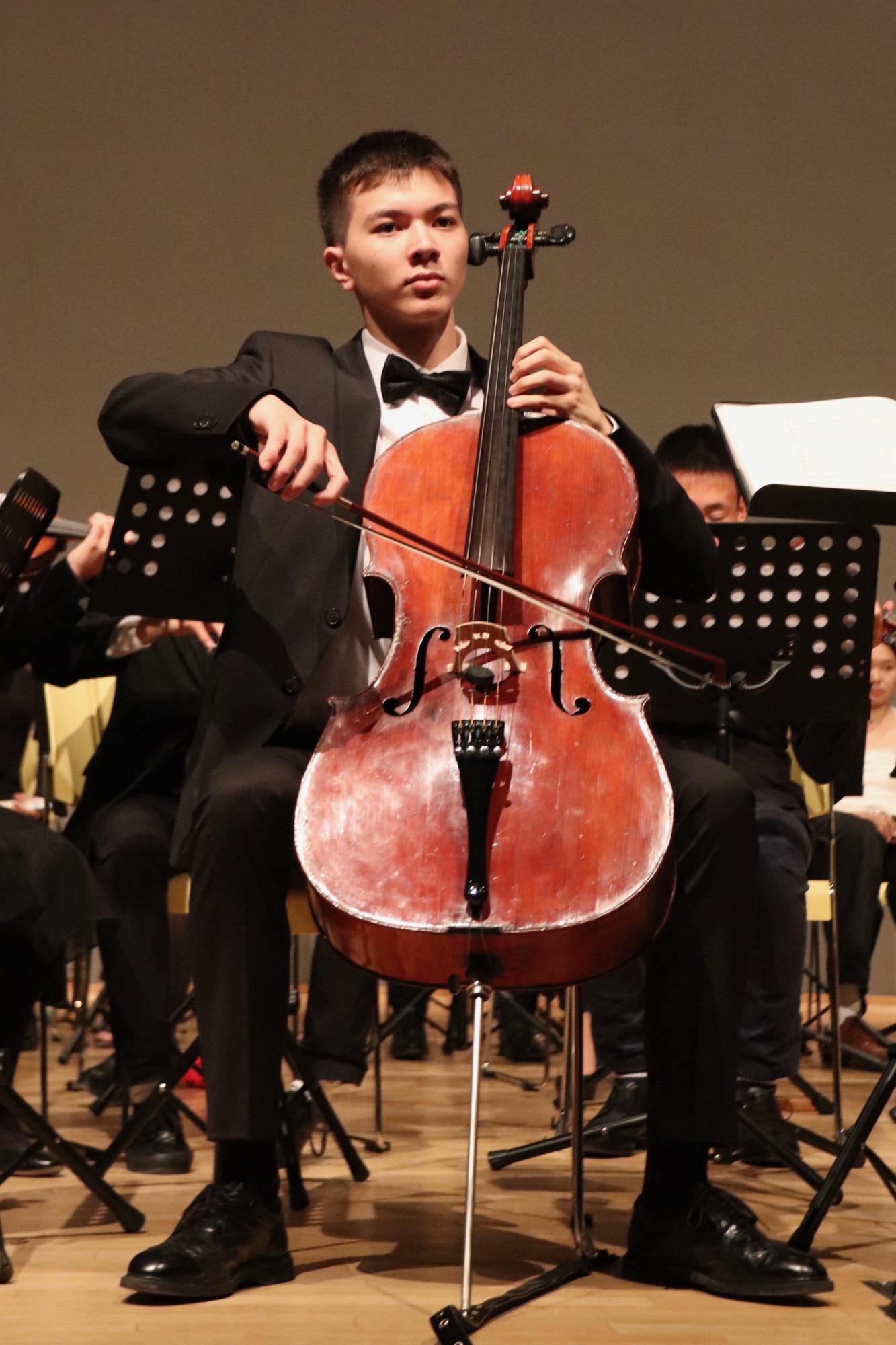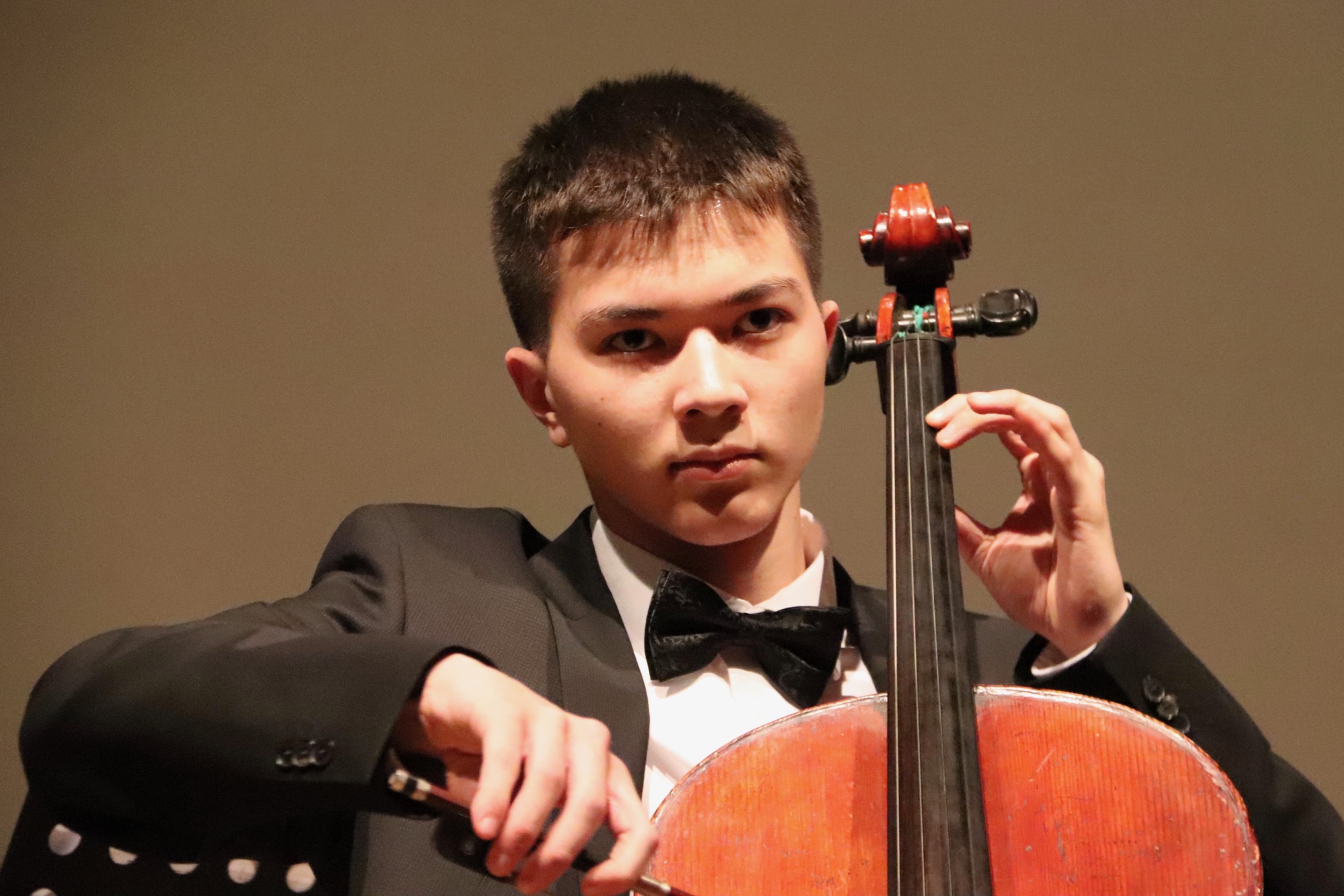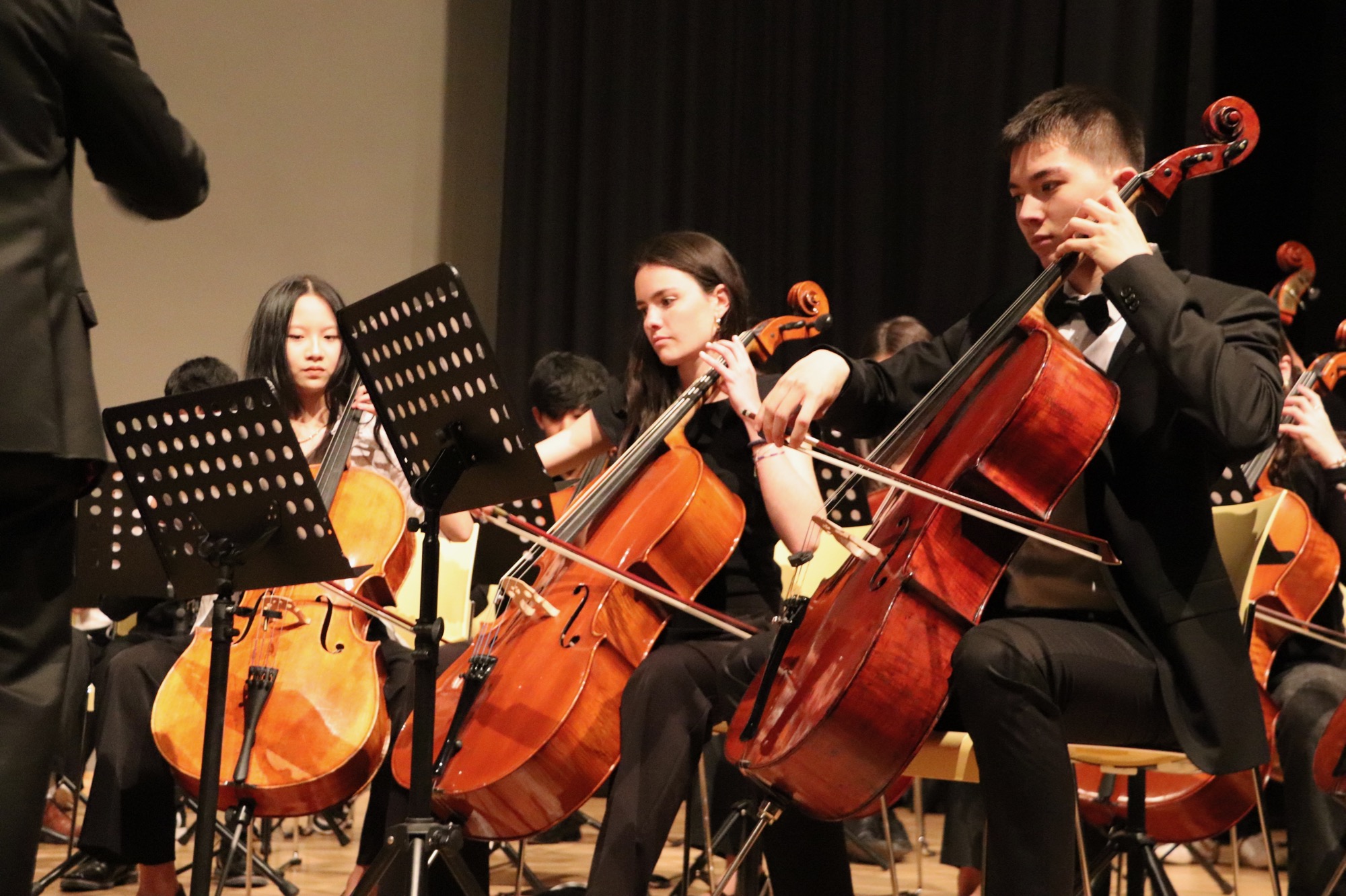 Nach der Pause gehörte dem Großen Orchester unter Leitung von Herrn Neubeck und Herrn Leichtfuß die Bühne, dem mit der Titelmusik des Films „Die glorreichen Sieben“ von Elmer Bernstein ein schwungvoller Einstieg gelang. Beim „Allegro appassionato“ (op. 43) von Camille Saint-Saëns brillierte der mehrfach ausgezeichnete Gabriel Lindenschmidt (E2) als Solist am Cello.