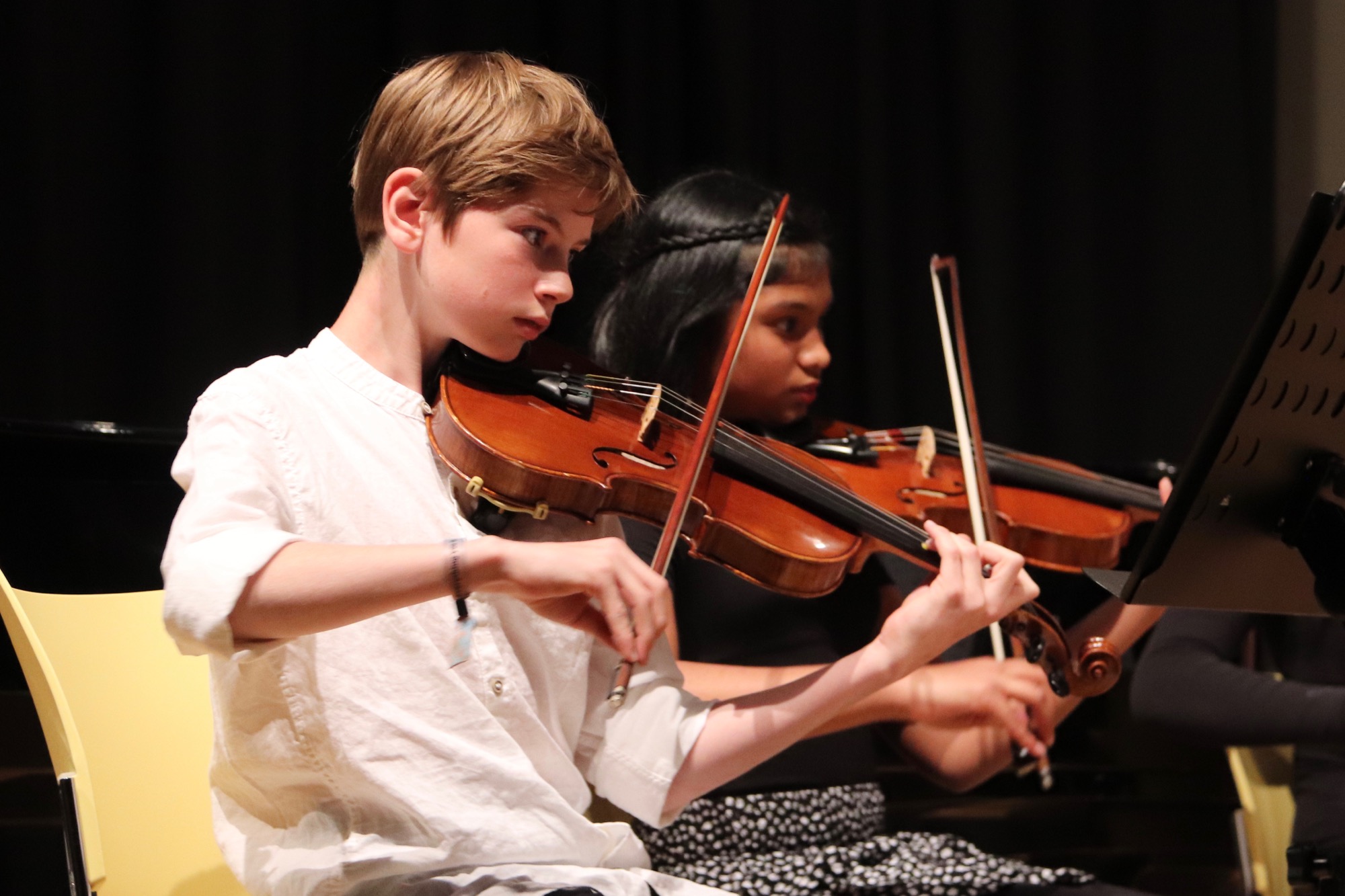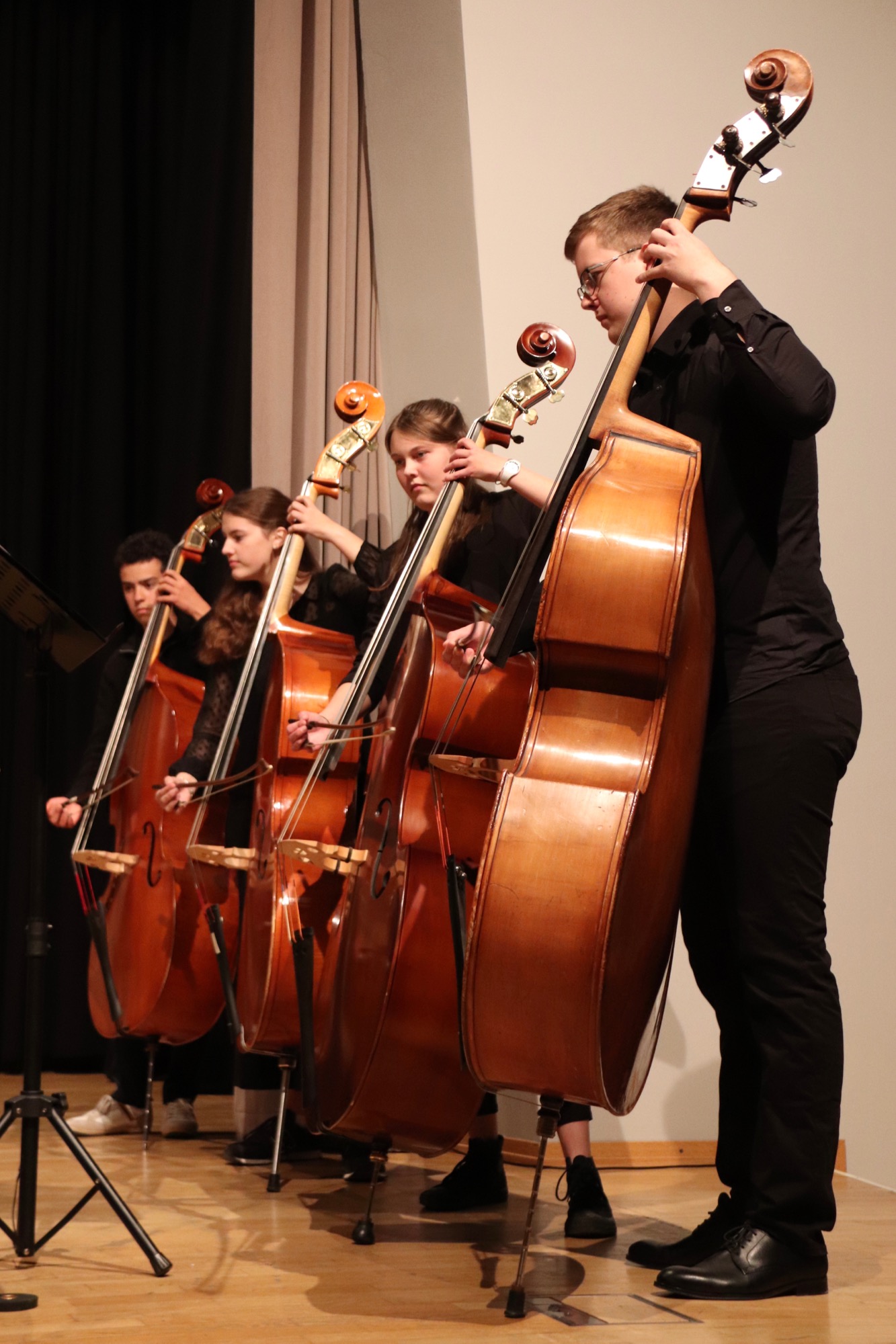 Am zweiten Abend machten die Jüngsten den Anfang: Die Streicherklasse 5 unter Leitung von Herrn Hublow stimmte das Volkslied „Muss i denn…“ und die Bourrée „Jozoemilufaroanda“ von Martin Hublow an. Die Bläserklasse 5 brachte unter der Leitung von Herrn Neubeck den Traditional „Hejo spann den Wagen an“, „Aura Lee“ von George R. Poulton und die „Ode an die Freude“ von Ludwig van Beethoven an.
