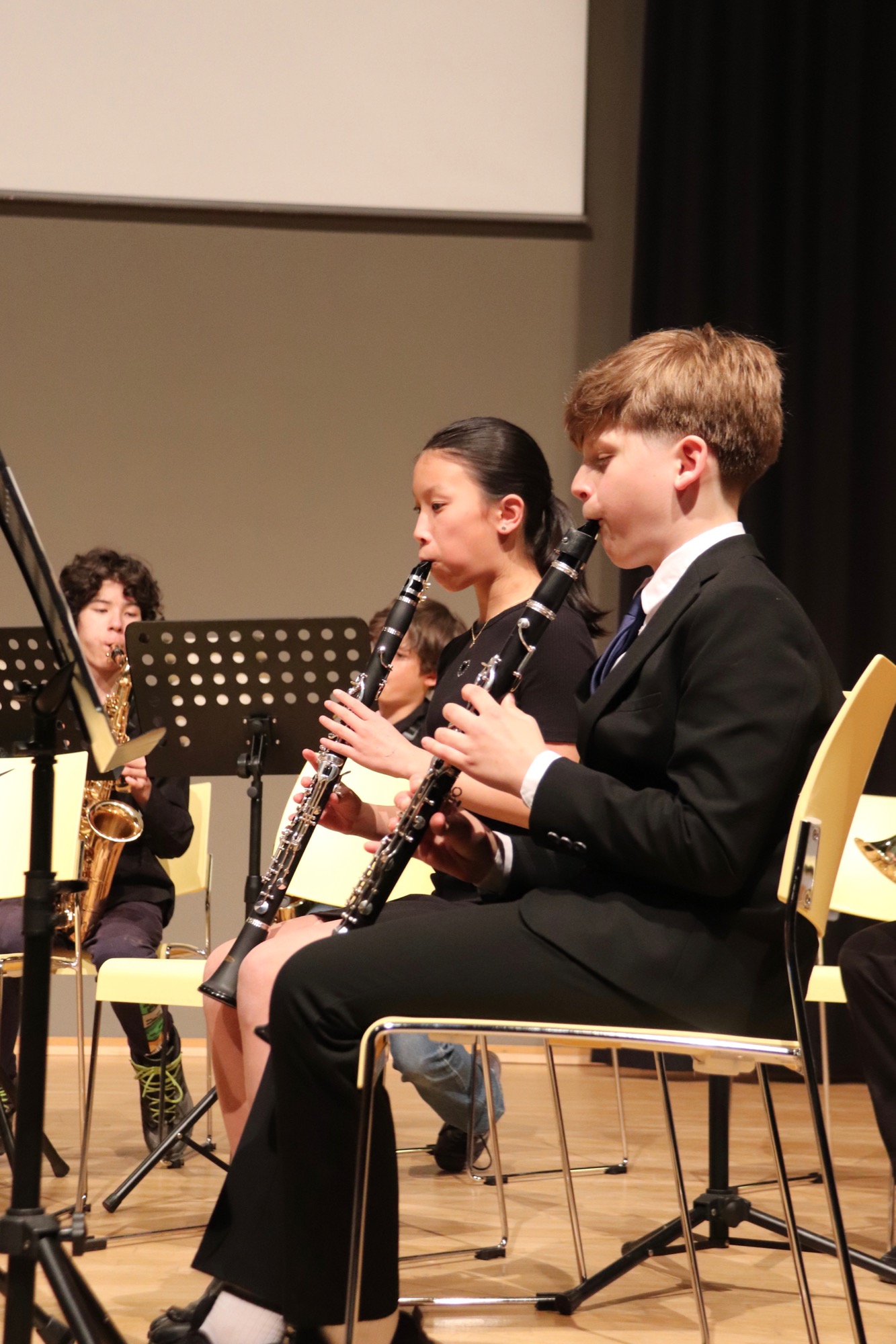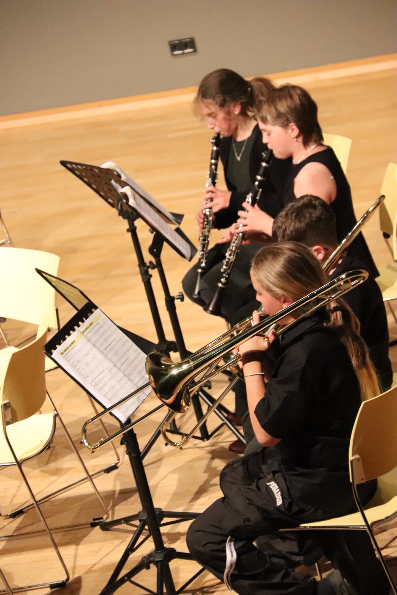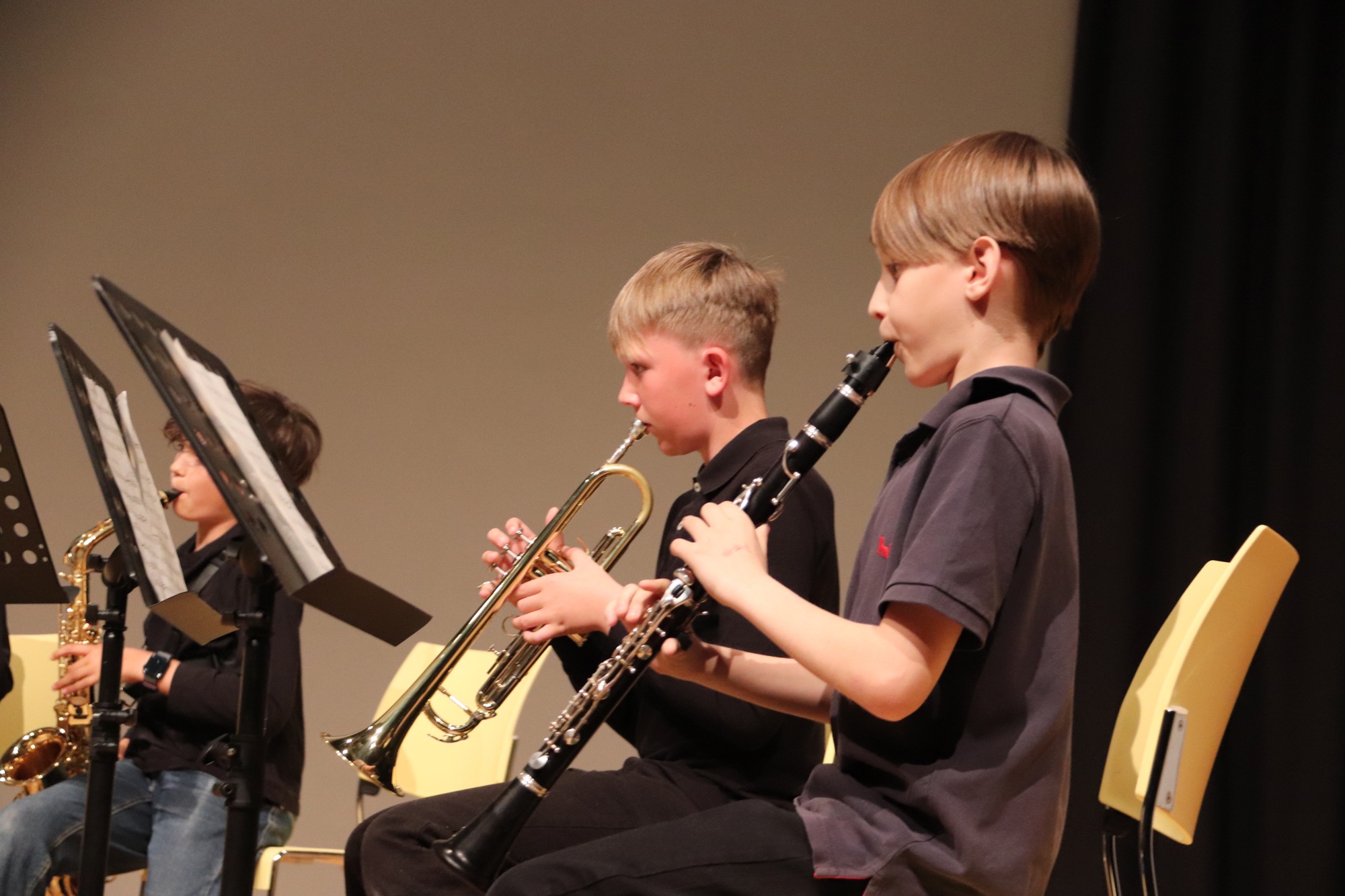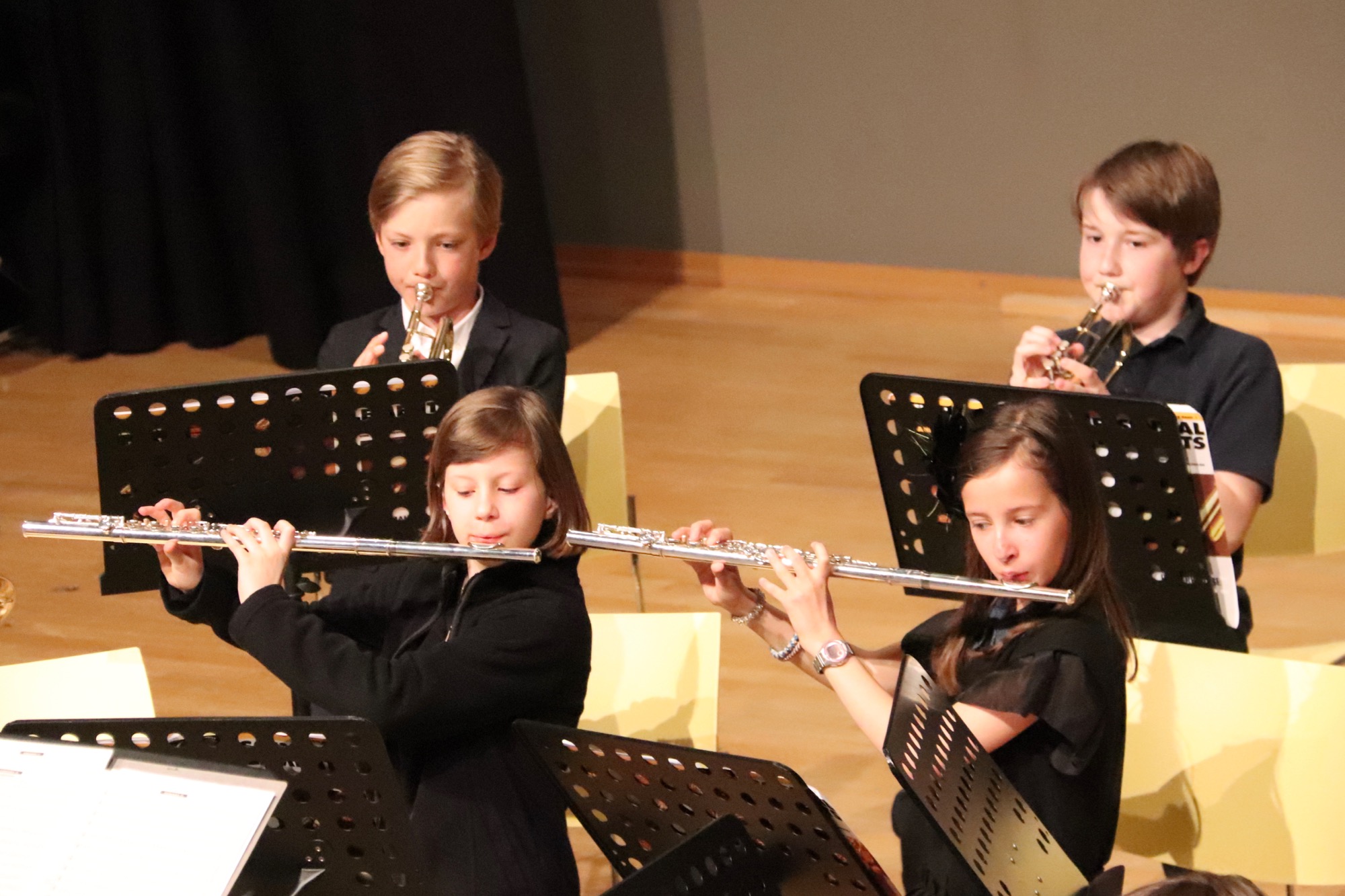Es folgten die etwas Größeren: Die Streicherklasse 6 unter Leitung von Frau Dr. Eden führte einen Choral von Michael Haydn (Bruder von Joseph Haydn), den Traditional „Zum Gali Gali“ sowie „Can-Can“ von Jacques Offenbach auf. Die Bläserklasse 6 unter Leitung von Herrn Hublow spielte „I like the Flowers“, einen Traditional, und die Stücke „The Medallion Calls“ und „The Black Pearl“ von Klaus Badelt und Hans Zimmer.