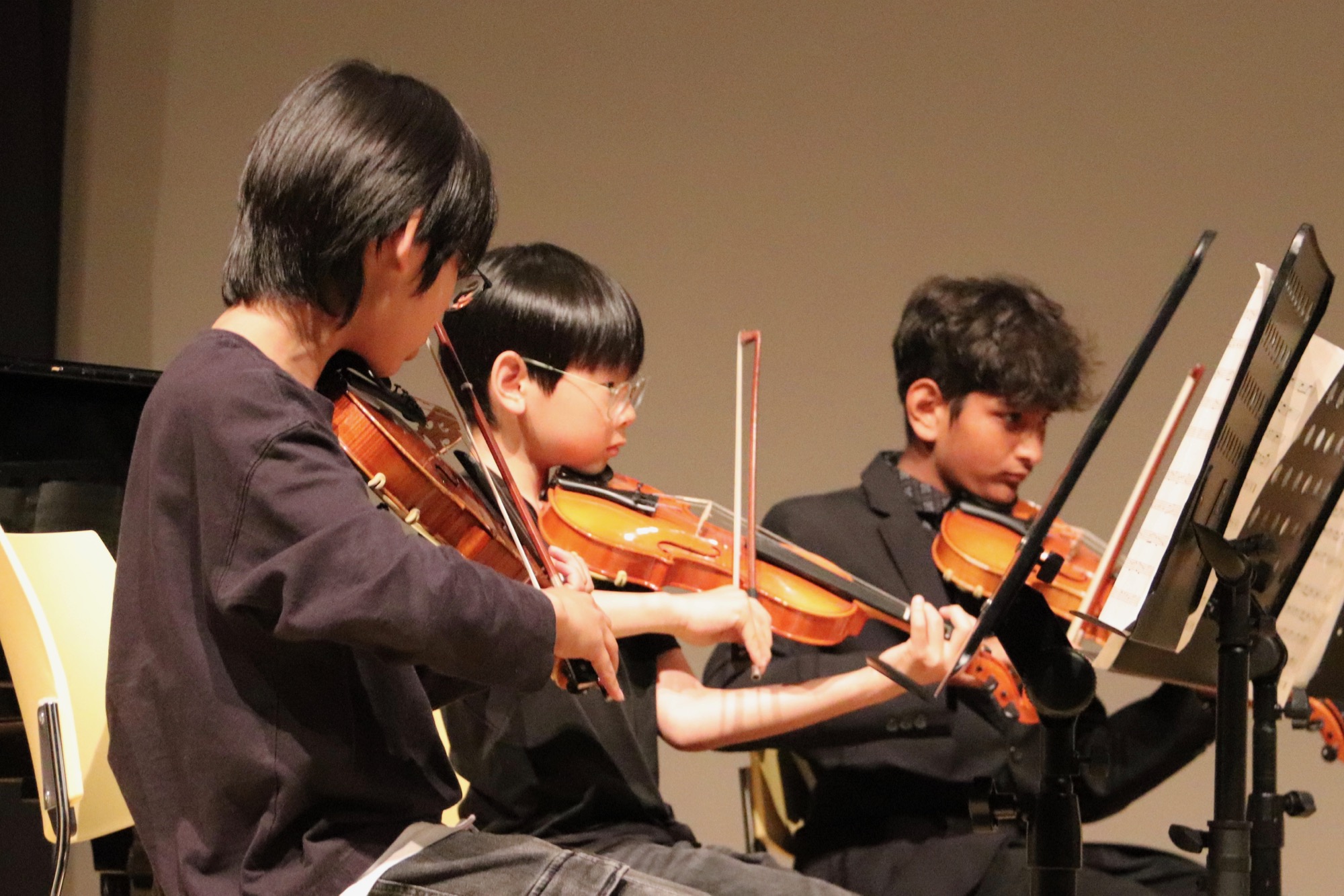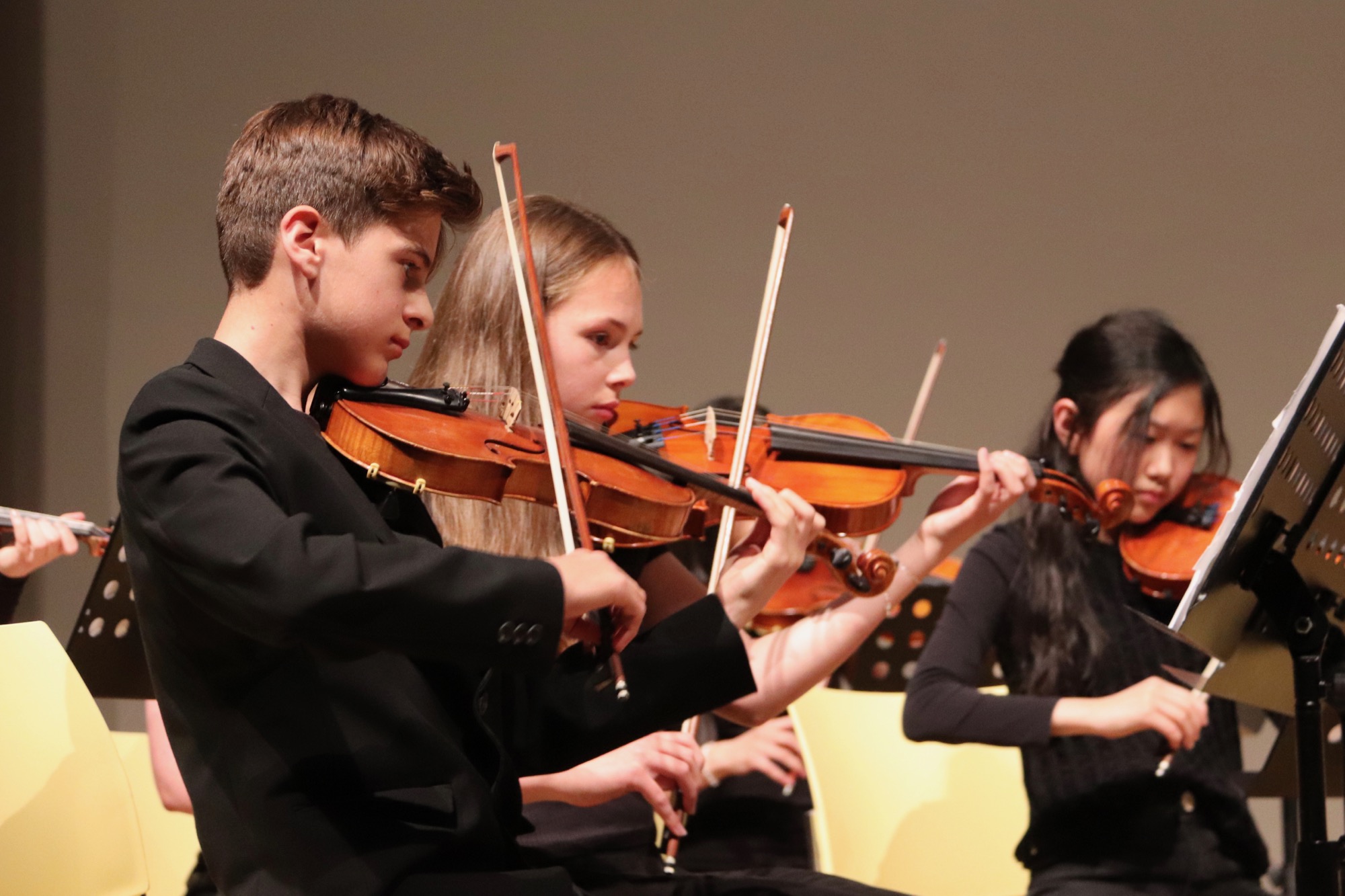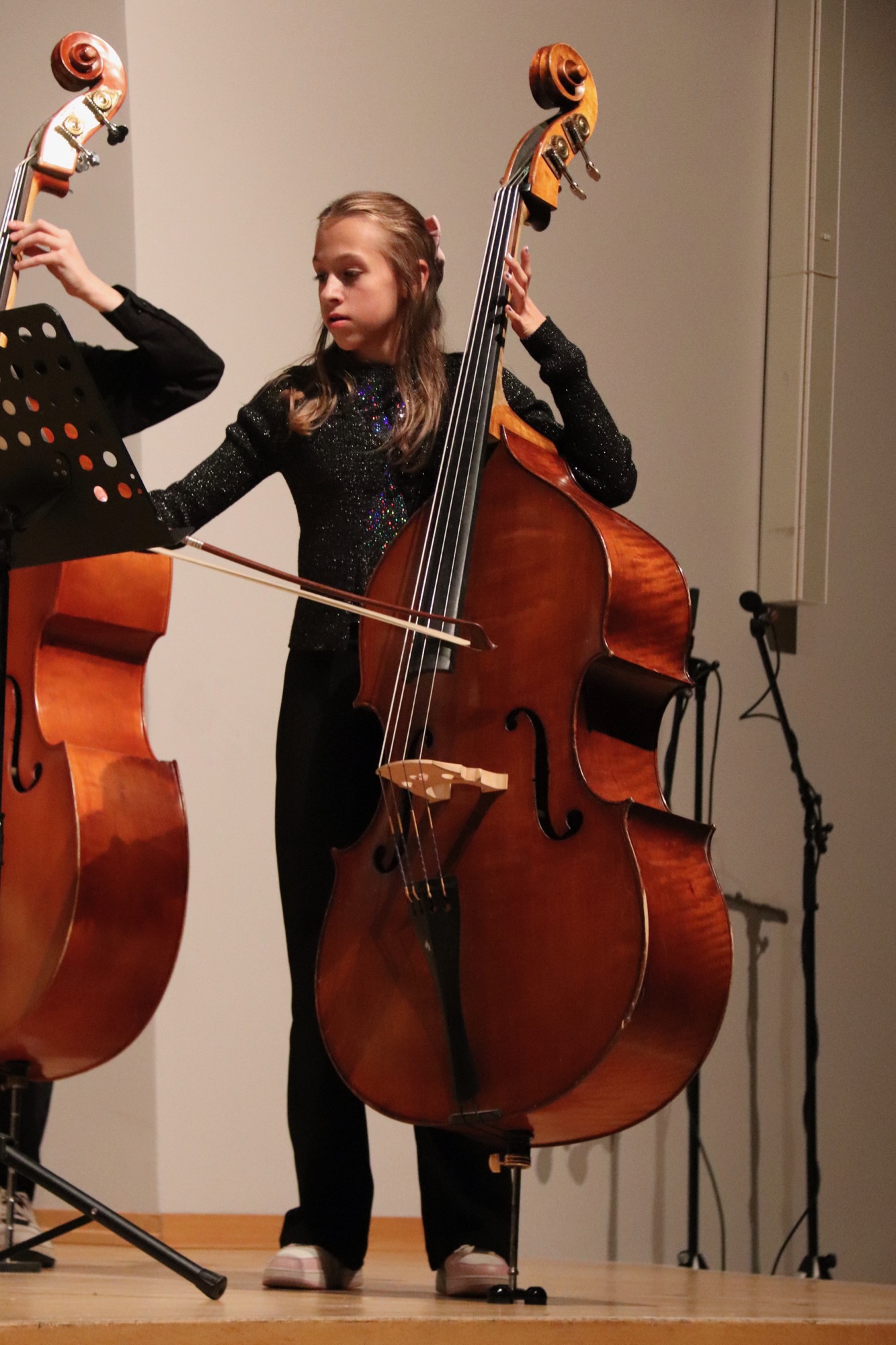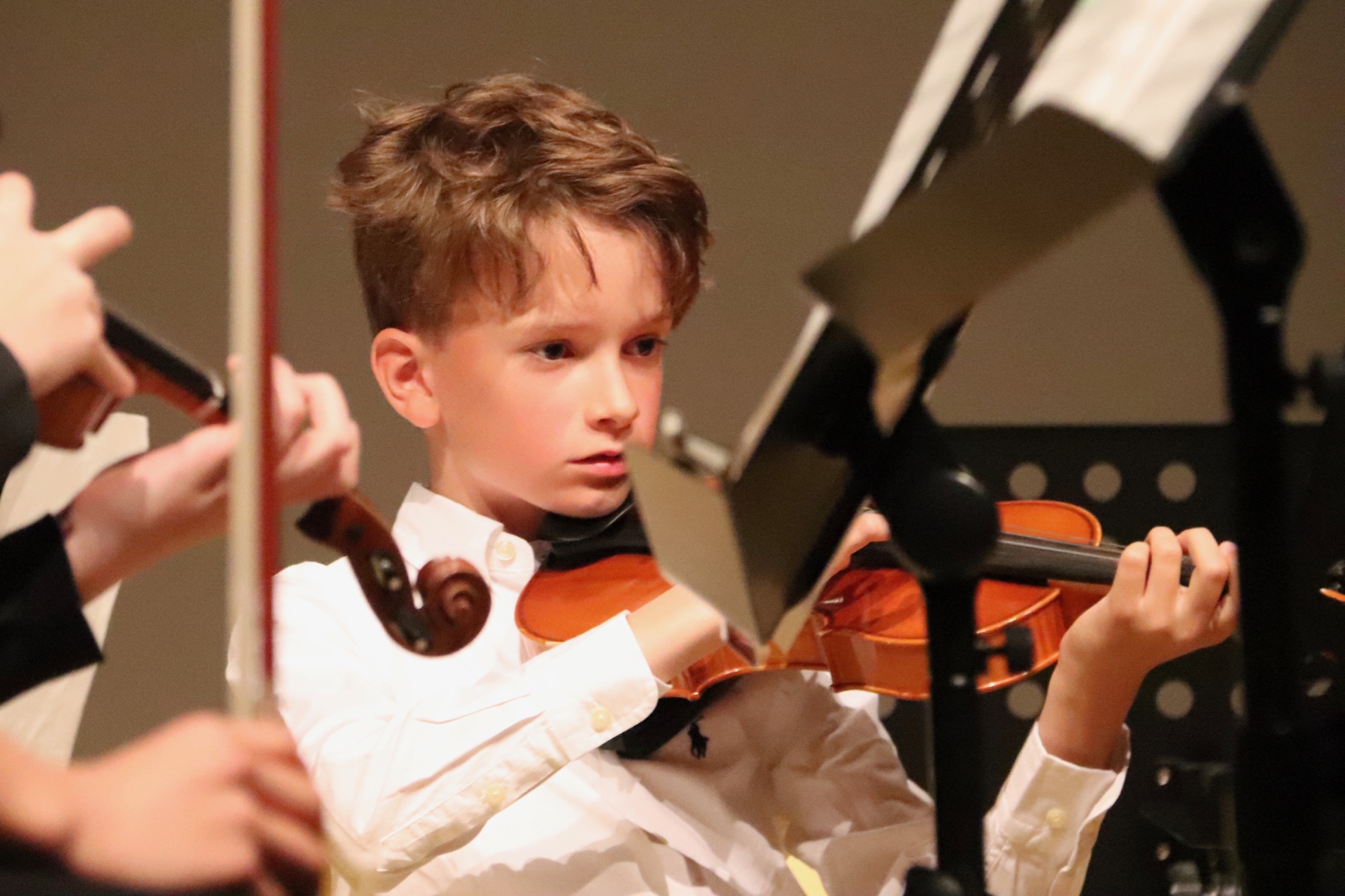 Es folgten die etwas Größeren: Die Streicherklasse 6 unter Leitung von Frau Dr. Eden führte einen Choral von Michael Haydn (Bruder von Joseph Haydn), den Traditional „Zum Gali Gali“ sowie „Can-Can“ von Jacques Offenbach auf. Die Bläserklasse 6 unter Leitung von Herrn Hublow spielte „I like the Flowers“, einen Traditional, und die Stücke „The Medallion Calls“ und „The Black Pearl“ von Klaus Badelt und Hans Zimmer.