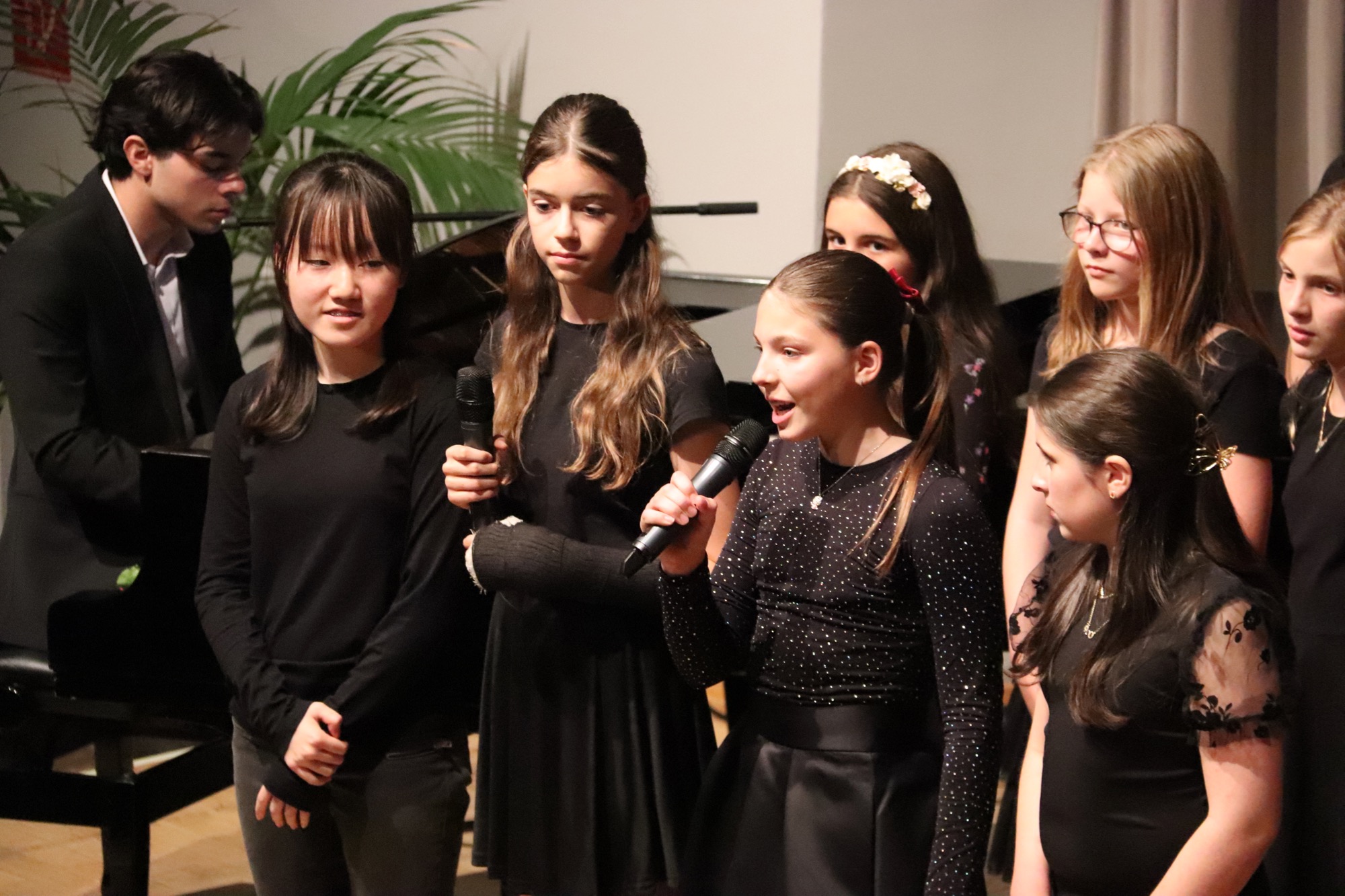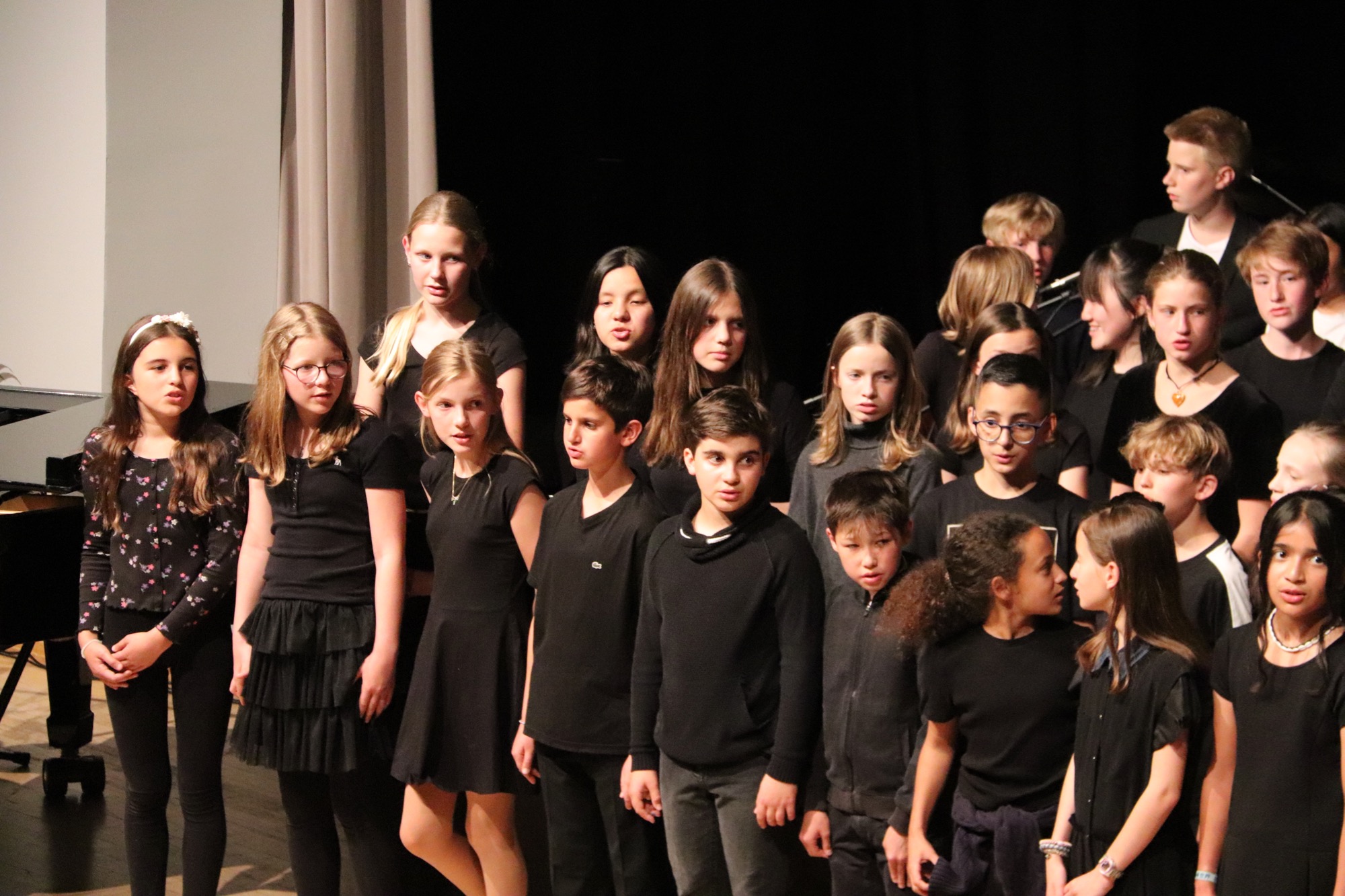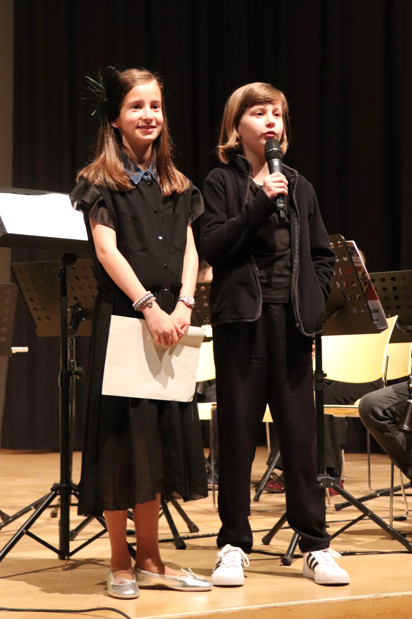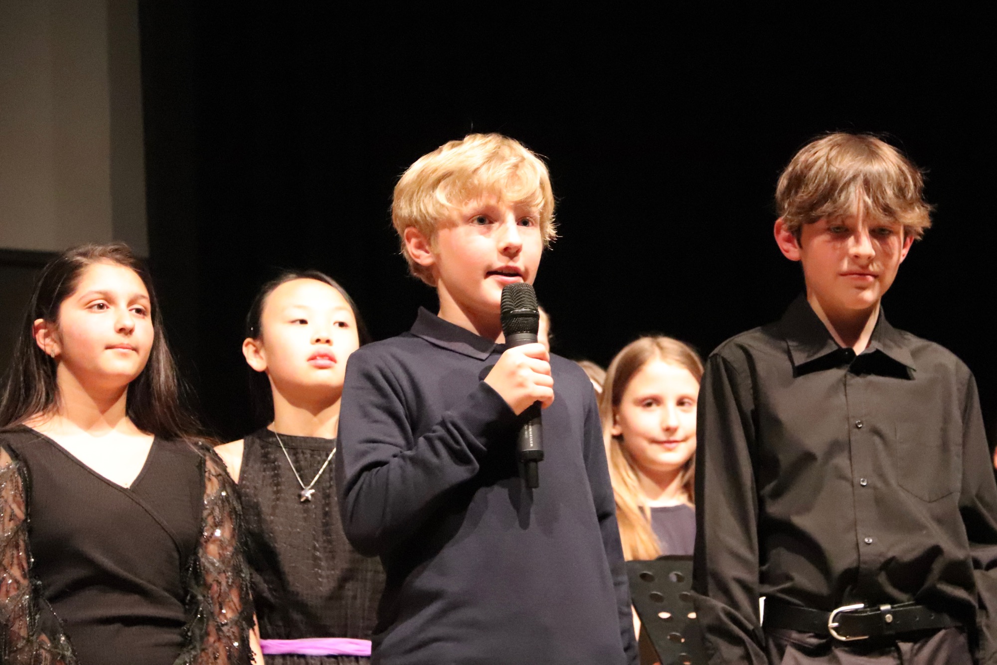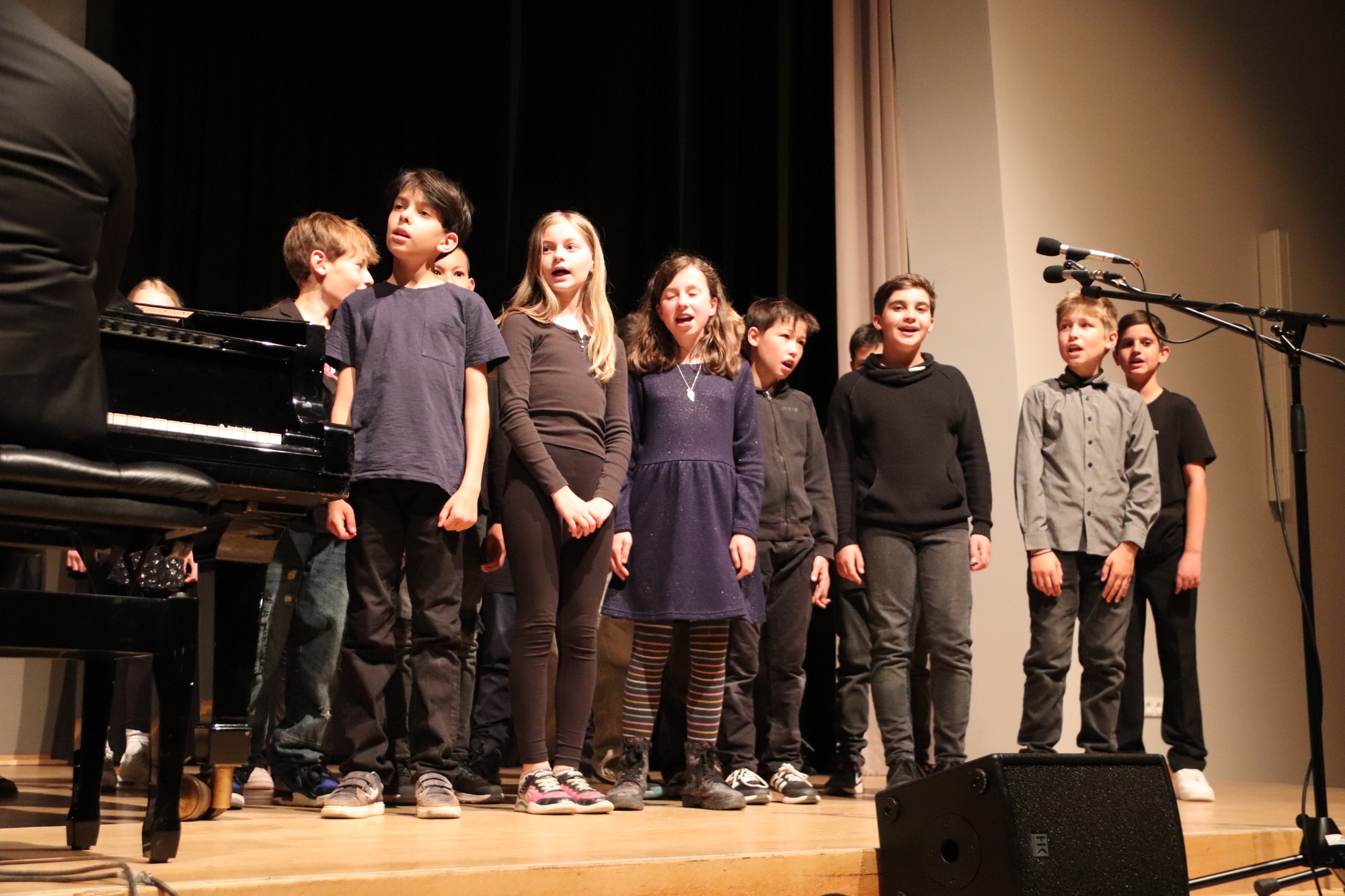 Nach der Pause gehörte die Bühne den jungen Sängerinnen und Sängern. Zunächst interpretierten die Kinder der Gesangsklasse 5 unter Leitung von Frau Büttner, Herrn Franke und Herrn Leichtfuß den Schlager „Ohne Krimi geht die Mimi nie ins Bett“ auf schwungvolle und humorvolle Art, gefolgt vom Chanson „Aux Champs-Élysées“ von Joe Dassin.