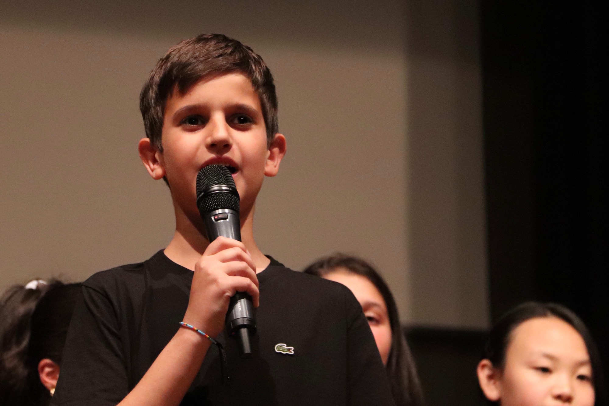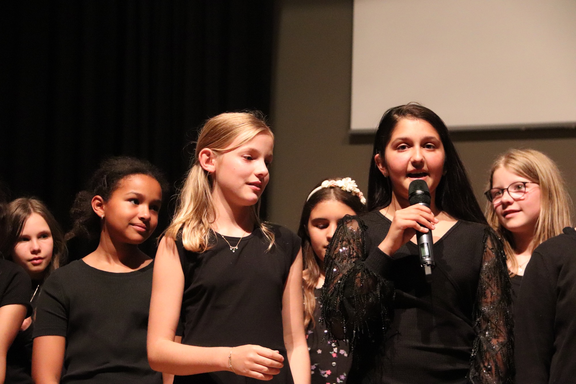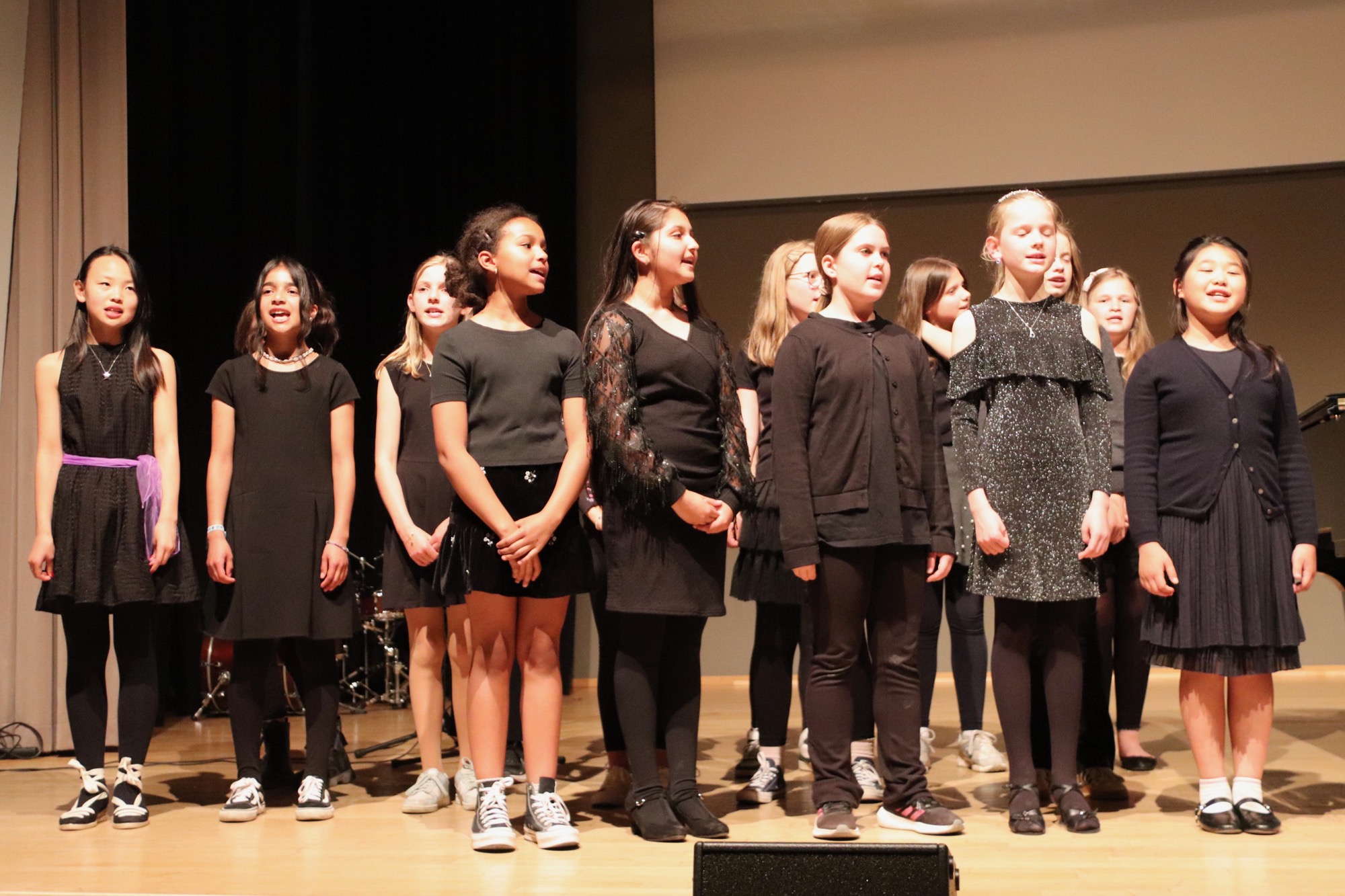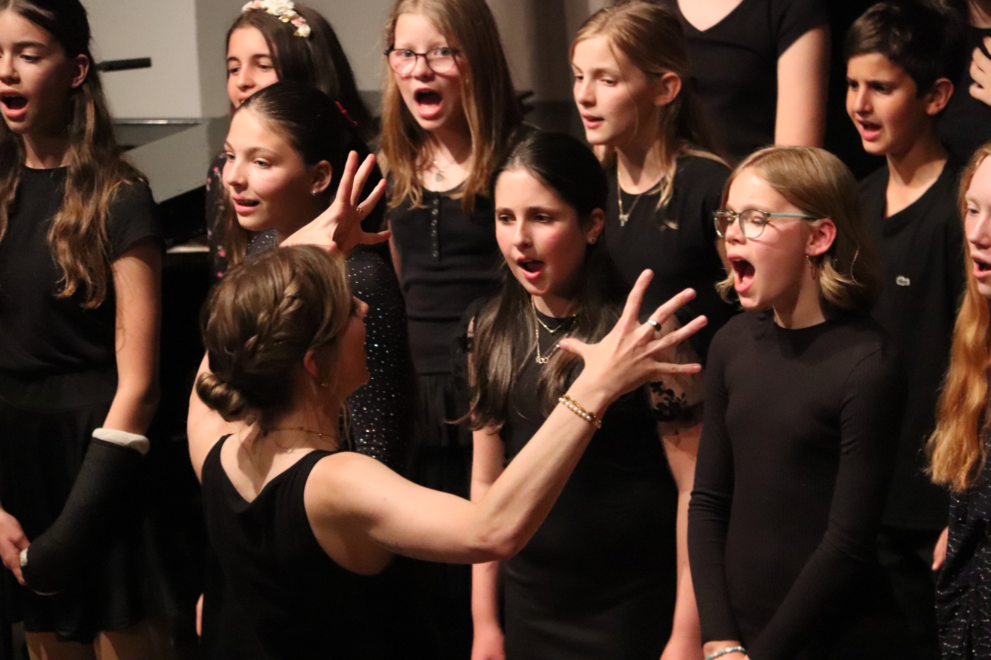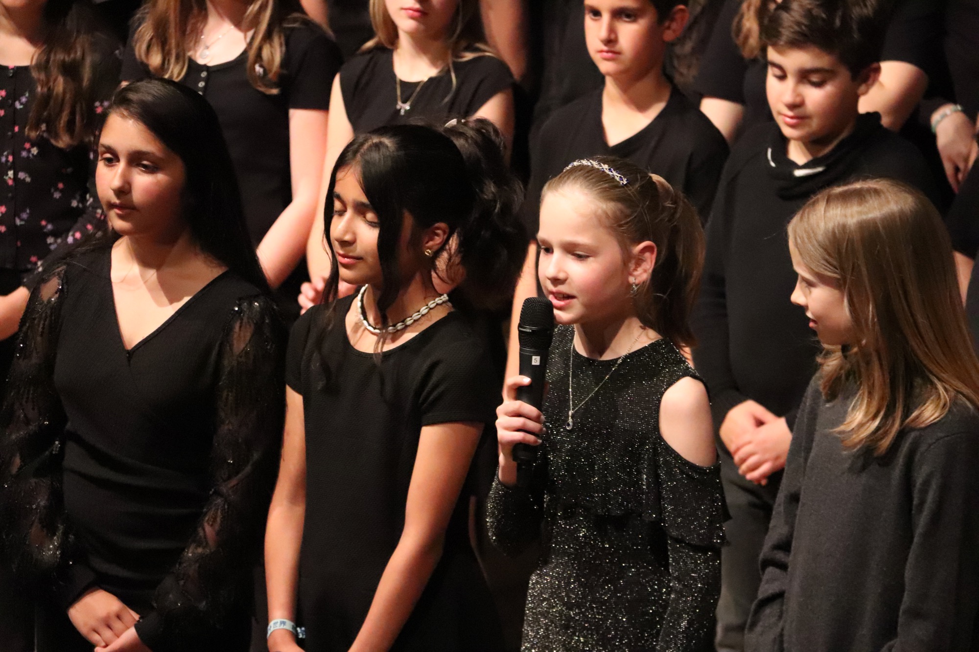 Nach der Pause gehörte die Bühne den jungen Sängerinnen und Sängern. Zunächst interpretierten die Kinder der Gesangsklasse 5 unter Leitung von Frau Büttner, Herrn Franke und Herrn Leichtfuß den Schlager „Ohne Krimi geht die Mimi nie ins Bett“ auf schwungvolle und humorvolle Art, gefolgt vom Chanson „Aux Champs-Élysées“ von Joe Dassin.